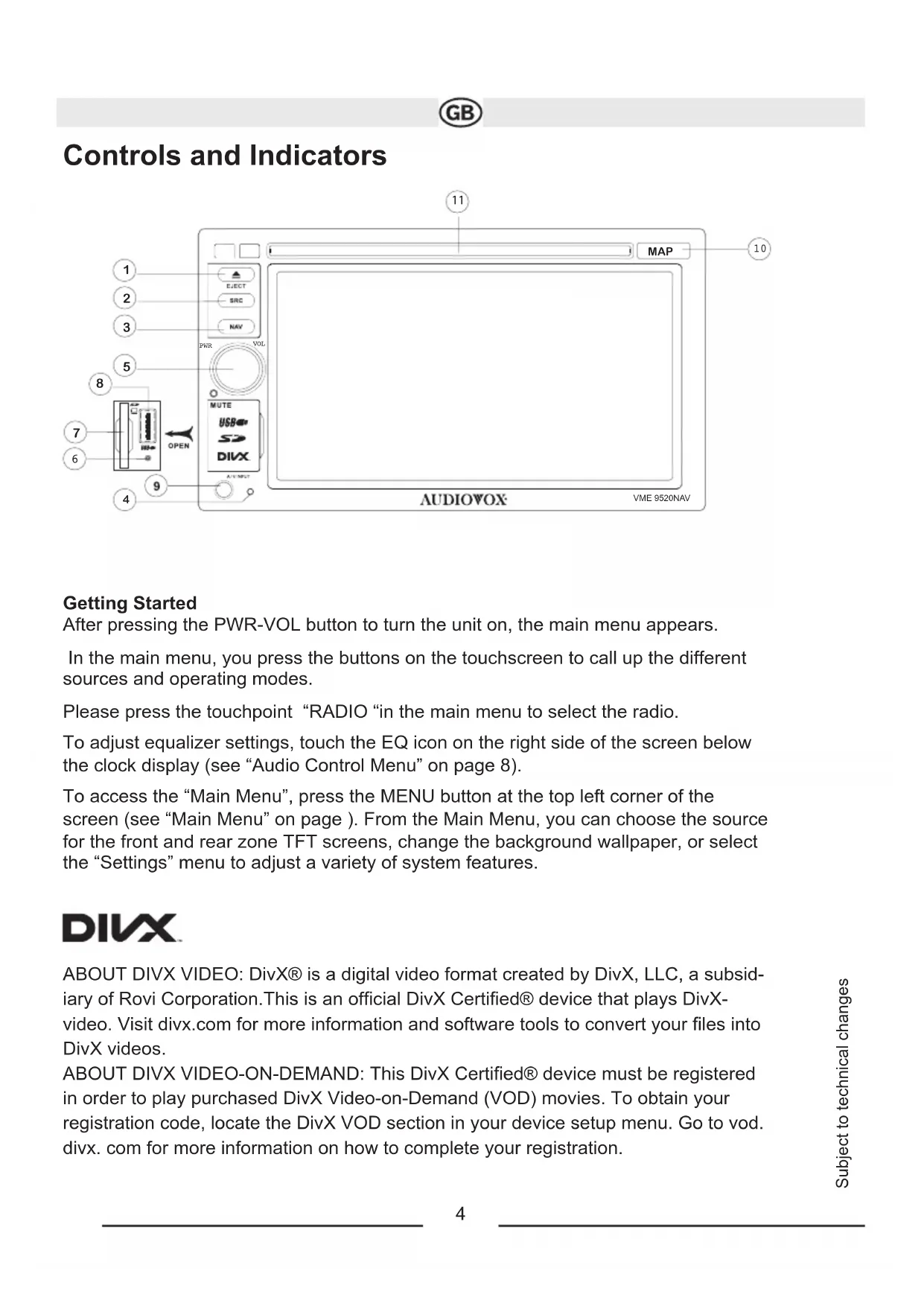 Accepts DVD/CD/MP3 discs. Controls and Indicators6 Subject to technical changes Disc: Select CD/DVD mode, (CD/DVD must be inserted). Radio: Select AM/FM radio mode. SD: Access the contents of the SD Card (SD card must be inserted). Front USB: Access a device connected to the front (A/V Input) USB connector. When an iPod is connected, this icon is labeled “Front iPod” and shows an iPod image. Bluetooth: View the Bluetooth menu. Camera: Access a signal from an external cam- era (optional accessory). Navigation: Select navigation mode. Rear USB: Access a device connected to the rear USB connector. When an iPod is con- nected, this icon is labeled “Rear iPod” and shows an iPod image. AV IN1: Access the AUX INPUT mode Wallpaper: Press to access the “Wallpaper” menu and choose from available wallpaper images. See “Wallpaper” on page . Front/Rear TFT: Independent sources can be played simultaneously on the VME 9520NAV. For example, a music source can be used on the main TFT screen while DVD video is available to rear passen- gers. Press Rear TFT on the bottom menu bar to switch between the front and rear zone source menus.