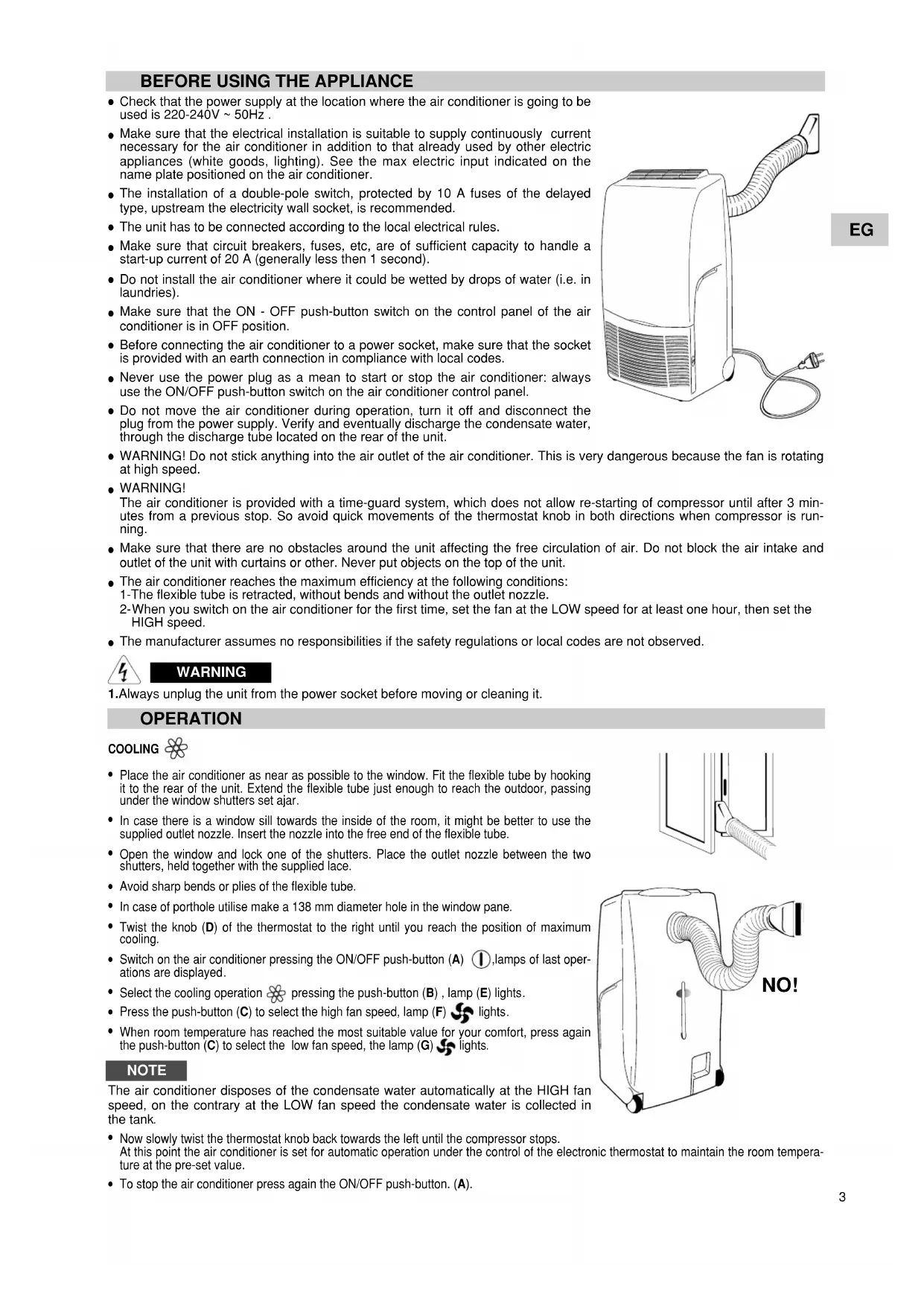 - Do not move the air conditioner during operation, turn it off and disconnect the plug from the power supply. Verify and eventually discharge the condensate water, through the discharge tube located on the rear of the unit.
