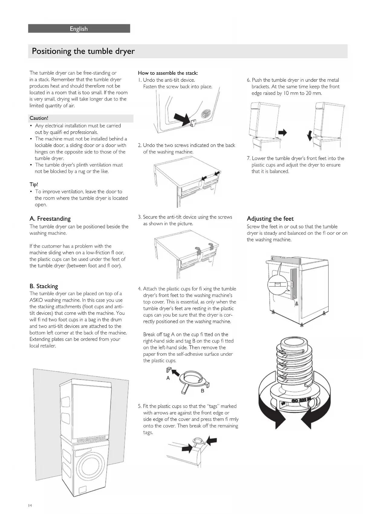 - To improve ventilation, leave the door to the room where the tumble dryer is located open. A. Freestanding The tumble dryer can be positioned beside the washing machine. If the customer has a problem with the machine sliding when on a low-friction fl oor, the plastic cups can be used under the feet of the tumble dryer (between foot and fl oor). B. Stacking The tumble dryer can be placed on top of a ASKO washing machine. In this case you use the stacking attachments (foot cups and anti- tilt devices) that come with the machine. You will fi nd two foot cups in a bag in the drum and two anti-tilt devices are attached to the bottom left corner at the back of the machine. Extending plates can be ordered from your local retailer. Adjusting the feet Screw the feet in or out so that the tumble dryer is steady and balanced on the fl oor or on the washing machine.15 Waste air from the tumble dryer must be taken to an evacuation duct or to an outlet in the wall using the vent hose supplied. Connection to the tumble dryer The tumble dryer has three options for venting air: at the back, on the right side and on the left side. One hole is open when the tumble dryer is supplied. The other two have covers. The tumble dryer comes with a connector (1), a plastic band (2) and a vent hose (3). Fit the air evacuation system as follows:
