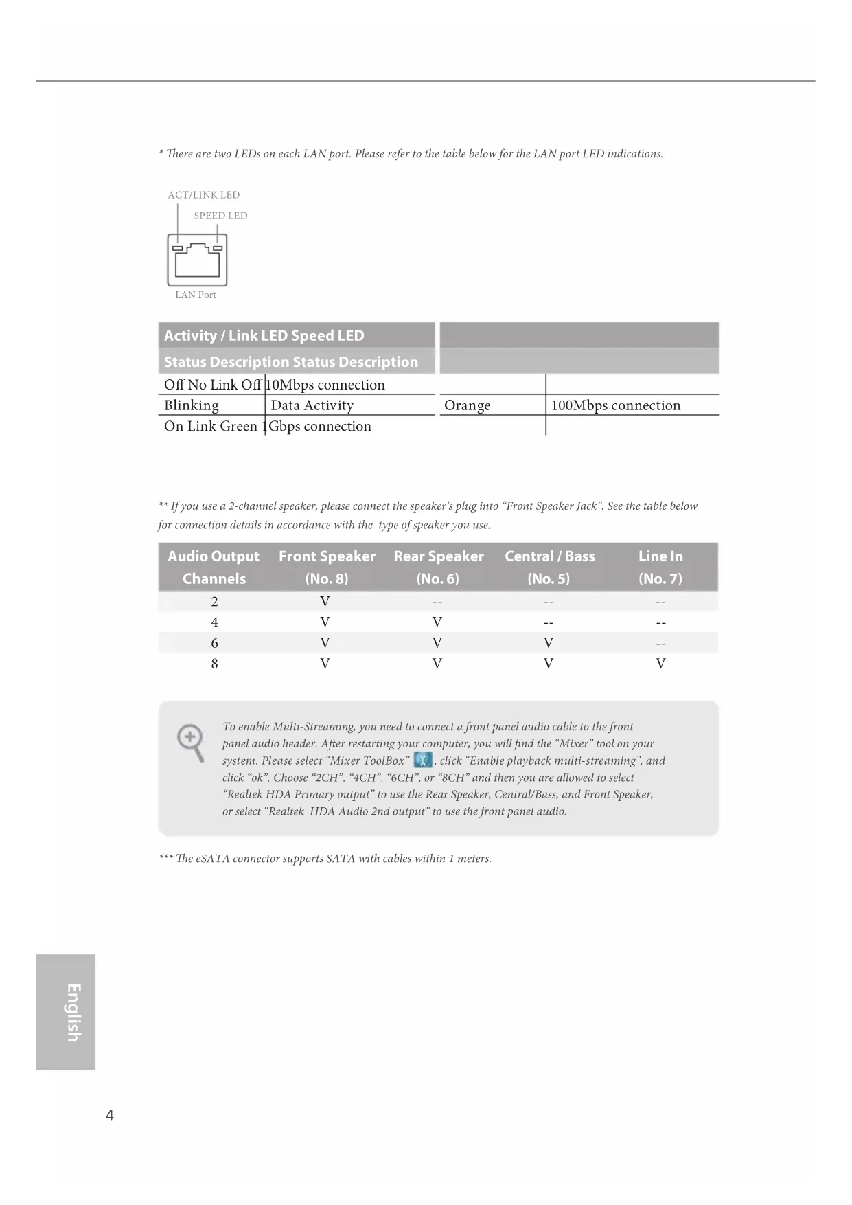 8 V V V V *** e eSATA connector supports SATA with cables within 1 meters.To enable Multi-Streaming, you need to connect a front panel audio cable to the front panel audio header. Aer restarting your computer, you will nd the “Mixer” tool on your system. Please select “Mixer ToolBox” , click “Enable playback multi-streaming”, and click “ok”. Choose “2CH”, “4CH”, “6CH”, or “8CH” and then you are allowed to select “Realtek HDA Primary output” to use the Rear Speaker, Central/Bass, and Front Speaker, or select “Realtek HDA Audio 2nd output” to use the front panel audio.ACT/LINK LEDSPEED LEDLAN PortH81M-ITX