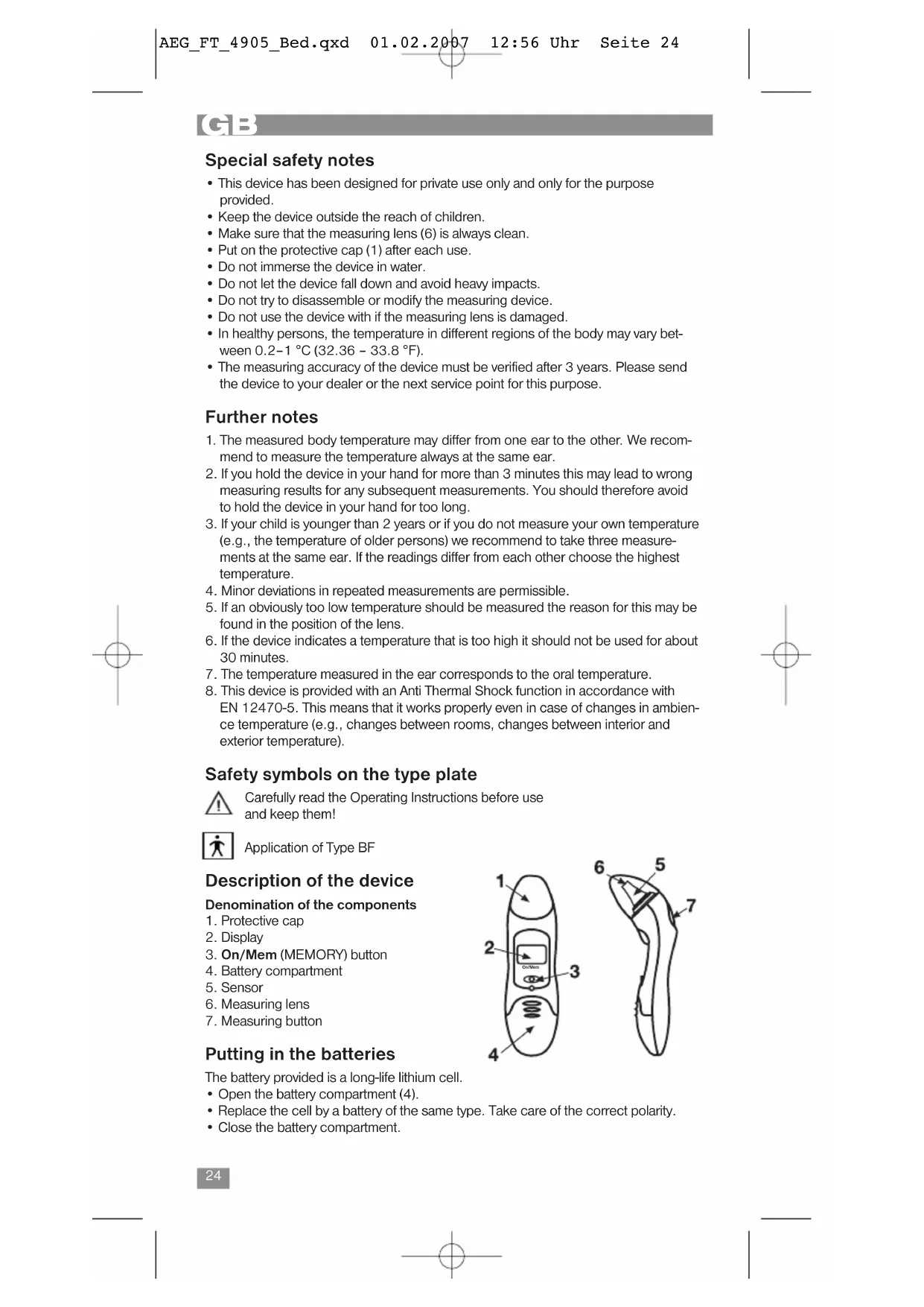 Download the instructions for your Thermomètre in PDF format for free! Find your manual FT 4905 - AEG and take your electronic device back in hand. On this page are published all the documents necessary for the use of your device. FT 4905 by AEG.