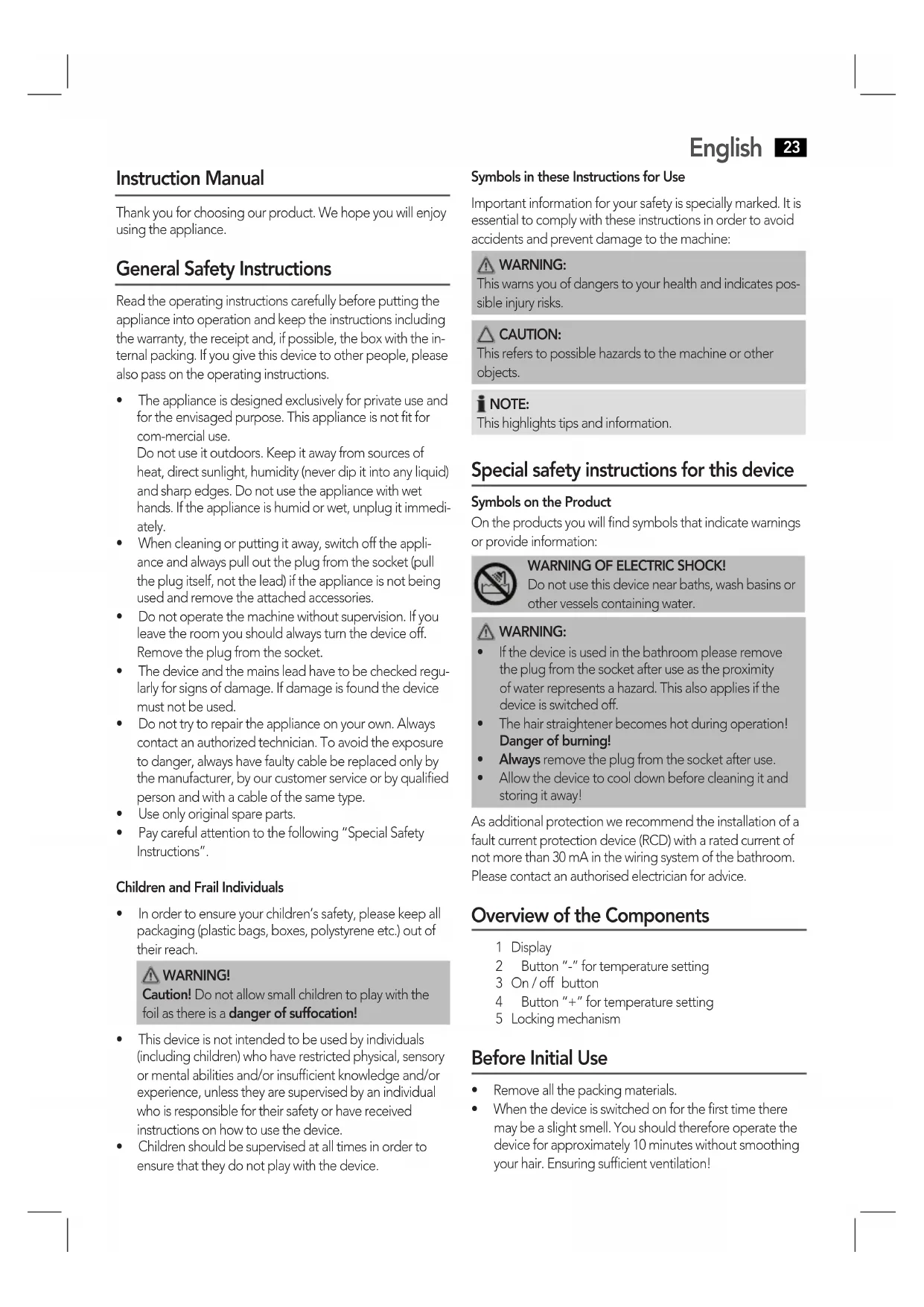 This warns you of dangers to your health and indicates pos- sible injury risks. CAUTION: This refers to possible hazards to the machine or other objects. NOTE: This highlights tips and information. Special safety instructions for this device Symbols on the Product On the products you will find symbols that indicate warnings or provide information: WARNING OF ELECTRIC SHOCK! Do not use this device near baths, wash basins or other vessels containing water.