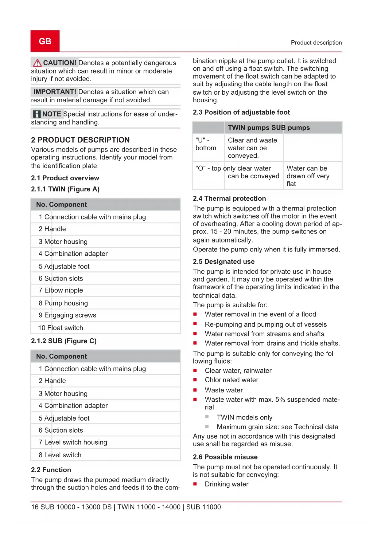 Product description CAUTION! Denotes a potentially dangerous situation which can result in minor or moderate injury if not avoided. IMPORTANT! Denotes a situation which can result in material damage if not avoided. NOTE Special instructions for ease of under- standing and handling. 2 PRODUCT DESCRIPTION Various models of pumps are described in these operating instructions. Identify your model from the identification plate.