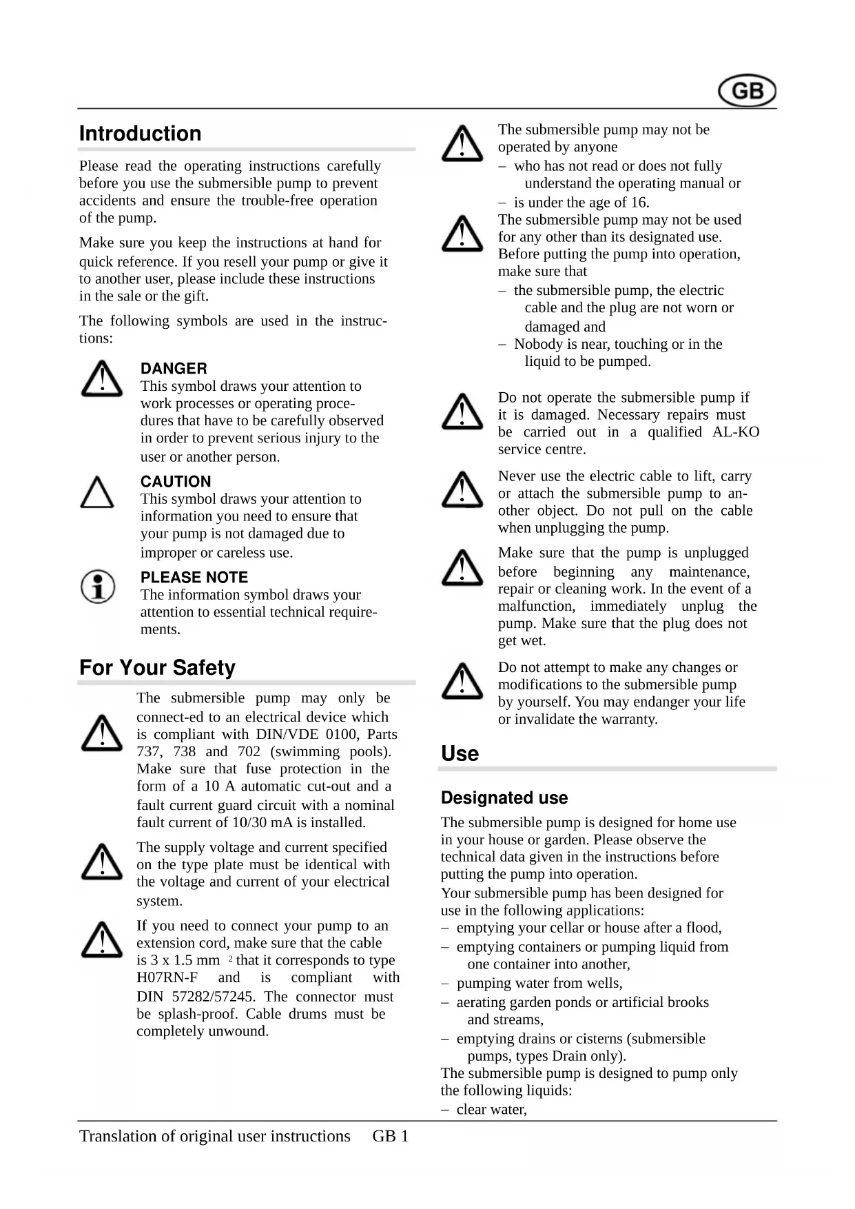 Before you attempt to remedy any malfunction of your pump, pull the plug to prevent injury or death due to electrocution! What is wrong? What is the possible reason? How to remedy the malfunc- tion: Motor does not run. Impeller is blocked. Remove blockage in inlet area. Clean the impeller with a jet of water. Thermal switch has switched off. Wait until the thermal switch has automatically turned the pump on again. Check water temperature. Have the pump checked. No power. Have a qualified electrician check the power supply. Float switch does not work even though liquid is above cut-in level. Send pump to your nearest AL-KO service centre. Submersible pump runs but is not pumping out liquid. Air is trapped in the pump hous- ing. Tilt the pump to let the trapped air out. Suction slots are blocked. Remove blockage and clean suction slots. Pressure line is blocked. Clear blockage in pressure line. Pressure hose is bent. Straighten out pressure hose. Submersible pump is only pump- ing out liquid very slowly or weakly. Hose diameter is too small. Attach a hose with a larger diameter. Suction slots are blocked. Remove blockage and clean suction slots. Pumping height is too great. Lower pumping height. If you are unable to remedy a malfunction, please call the AL-KO service centre nearest you. GB 4 Translation of original user instructionsIntroduction Avant de faire démarrer la pompe immergée, lire attentivement le présent livret de mode d’emploi afin de prévenir tout accident et afin d’assurer un fonctionnement parfait de l’appareil. Le mode d’emploi doit toujours se trouver à votre portée et il doit être transmis à tout usager qui aura acheté la pompe où à qui on l’aurait cédée. Dans le présent livret nous utiliserons les symbo- les suivants: