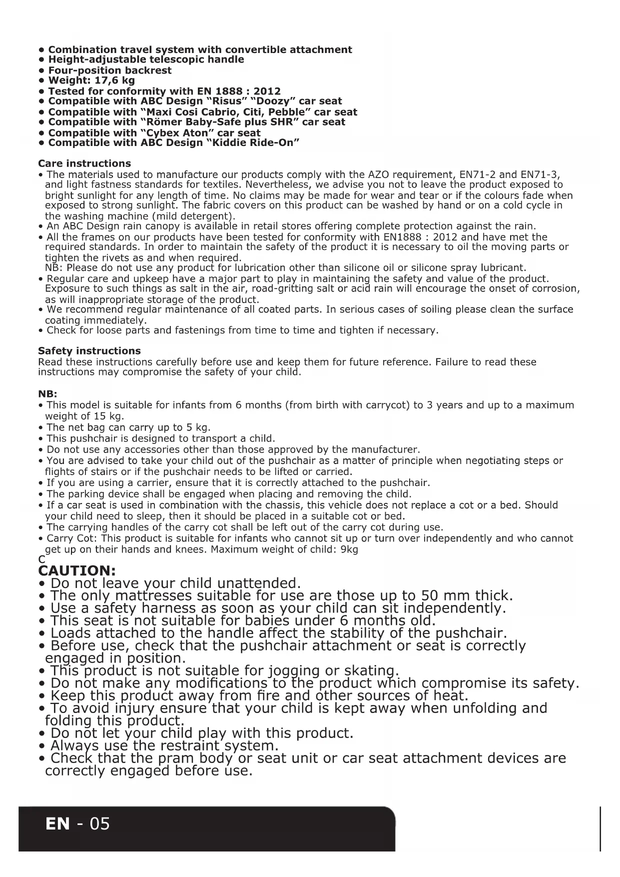 • An ABC Design rain canopy is available in retail stores offering complete protection against the rain.
