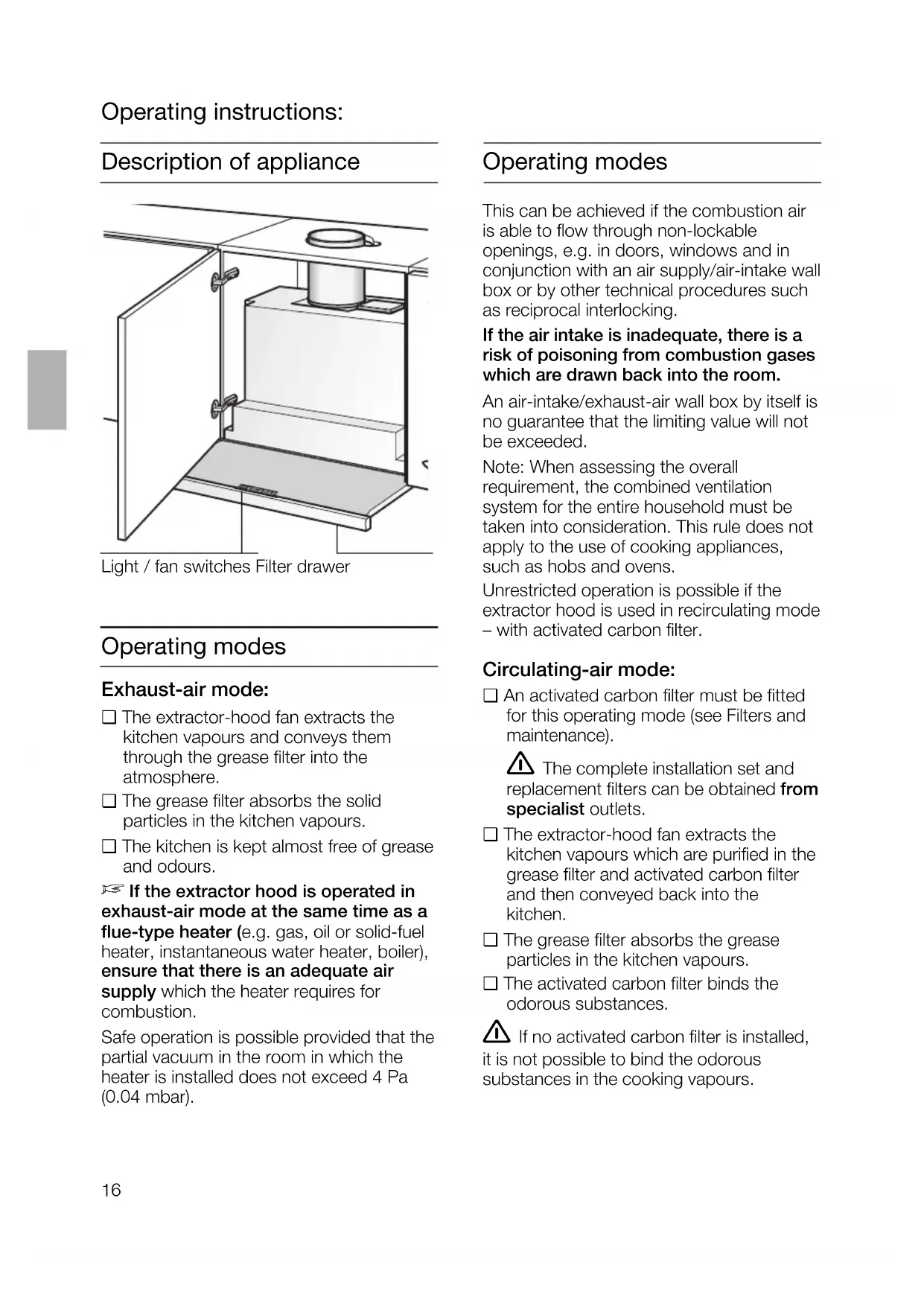 campana extractora: Girar los tornillos de fijación de los laterales izquierdo y derecho hacia adentro, hasta que las lengüetas de fijación se desplieguen lateralmente.16 Operating modes This can be achieved if the combustion air is able to flow through non-lockable openings, e.g. in doors, windows and in conjunction with an air supply/air-intake wall box or by other technical procedures such as reciprocal interlocking. If the air intake is inadequate, there is a risk of poisoning from combustion gases which are drawn back into the room. An air-intake/exhaust-air wall box by itself is no guarantee that the limiting value will not be exceeded. Note: When assessing the overall requirement, the combined ventilation system for the entire household must be taken into consideration. This rule does not apply to the use of cooking appliances, such as hobs and ovens. Unrestricted operation is possible if the extractor hood is used in recirculating mode – with activated carbon filter. Circulating-air mode: ❑ An activated carbon filter must be fitted for this operating mode (see Filters and maintenance). The complete installation set and replacement filters can be obtained from specialist outlets. ❑ The extractor-hood fan extracts the kitchen vapours which are purified in the grease filter and activated carbon filter and then conveyed back into the kitchen. ❑ The grease filter absorbs the grease particles in the kitchen vapours. ❑ The activated carbon filter binds the odorous substances. If no activated carbon filter is installed, it is not possible to bind the odorous substances in the cooking vapours. Light / fan switches Filter drawer Description of appliance Operating instructions: Operating modes Exhaust-air mode: ❑ The extractor-hood fan extracts the kitchen vapours and conveys them through the grease filter into the atmosphere. ❑ The grease filter absorbs the solid particles in the kitchen vapours. ❑ The kitchen is kept almost free of grease and odours.