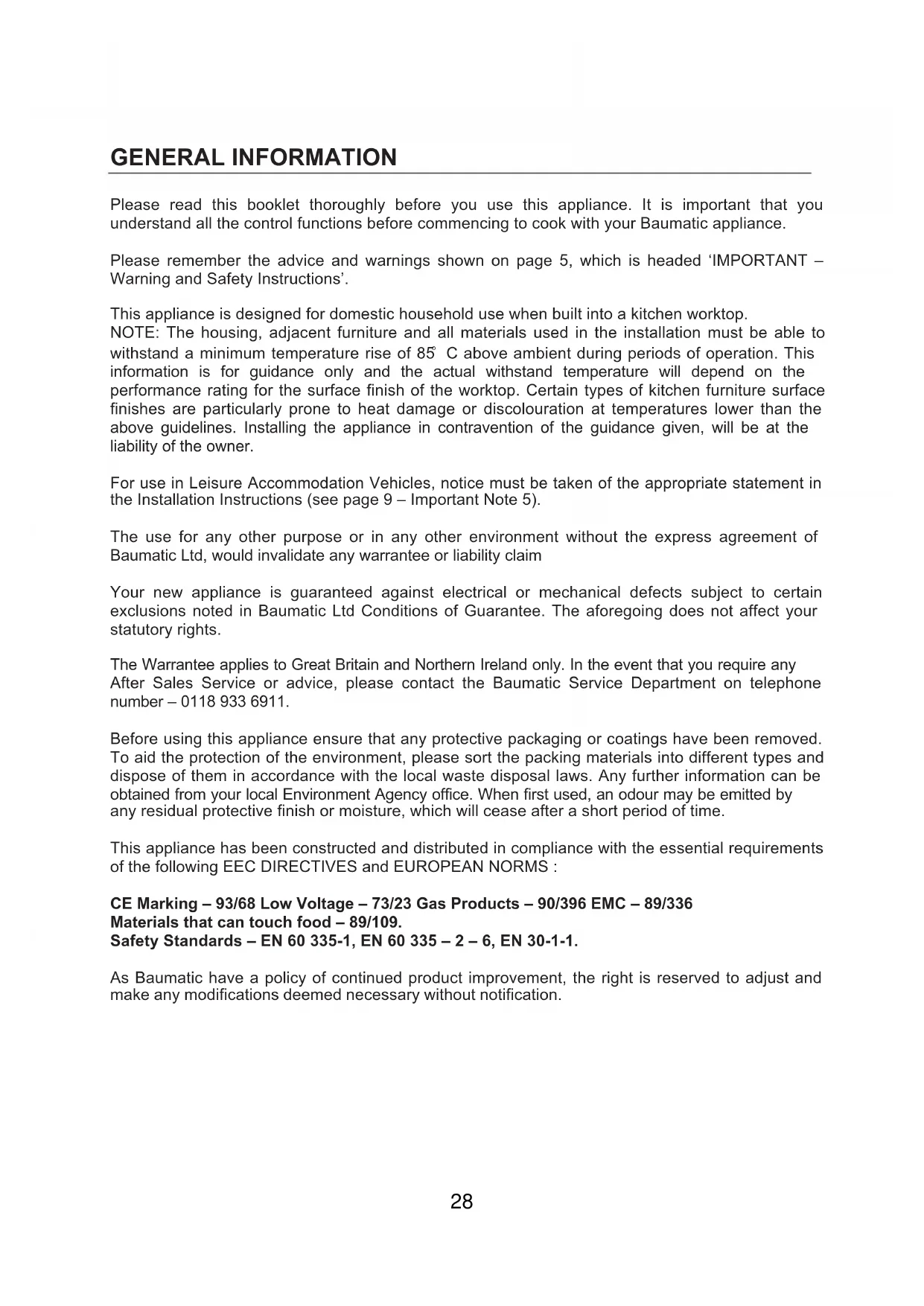 This appliance complies with all current European safety legislation, however Baumatic do wish to emphasise that compliance does not remove the fact that surfaces will become hot during use and retain heat after operation.