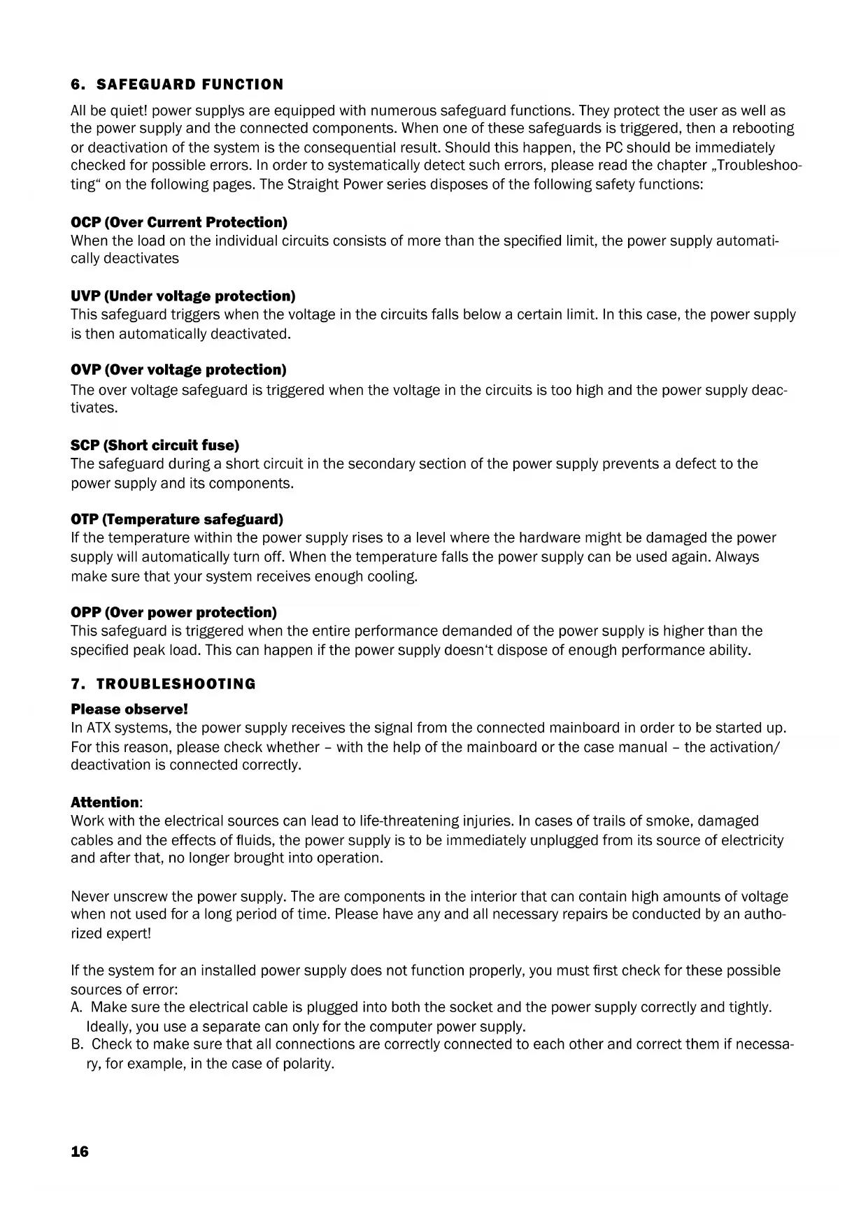 All be quiet! power supplies are equipped with numerous safeguard functions. They protect the user as well as the power supply and the connected components. When one of these safeguards is triggered, then a rebooting or deactivation of the system is the consequential result. Should this happen, the PC should be immediately checked for possible errors. In order to systematically detect such errors, please read the chapter „Troubleshooting" on the following pages. The Straight Power series disposes of the following safety functions:
