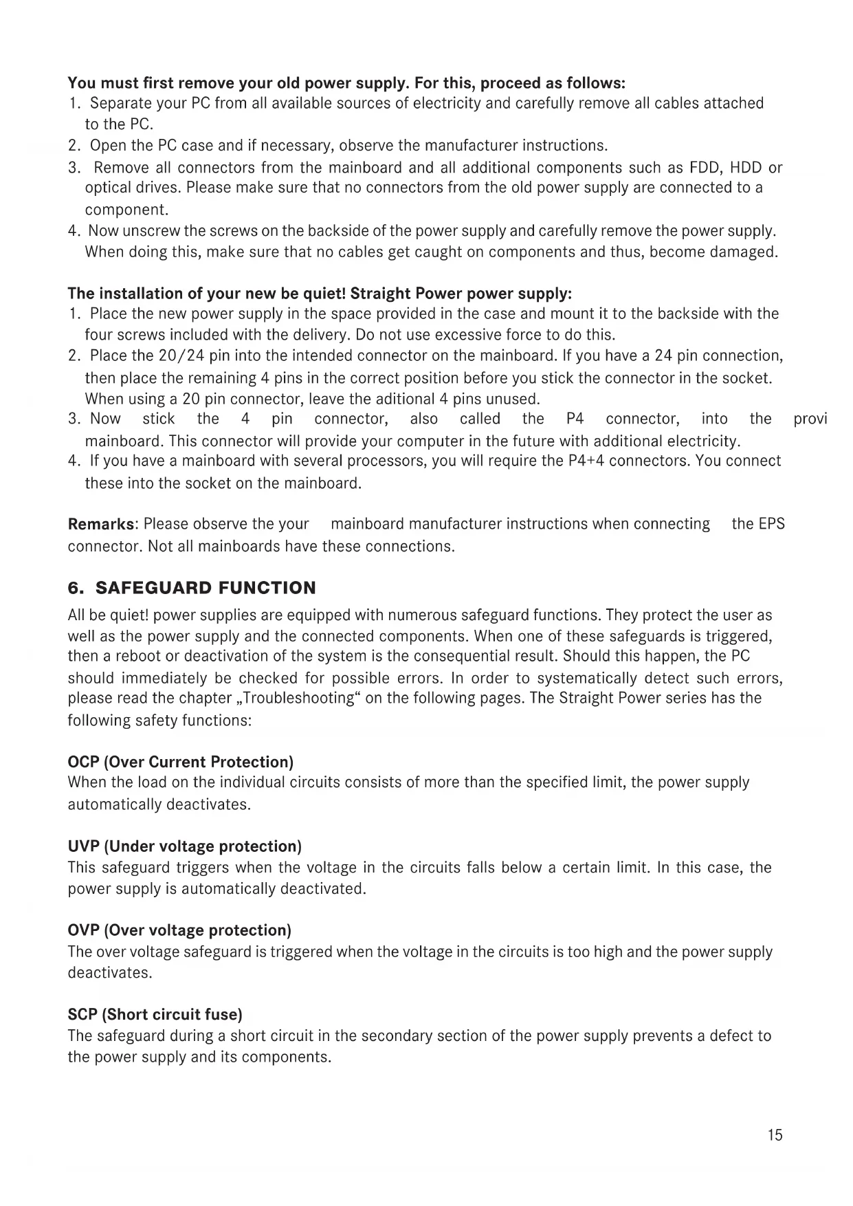 All be quiet! power supplies are equipped with numerous safeguard functions. They protect the user as well as the power supply and the connected components. When one of these safeguards is triggered, thenarebootordeactivationofthesystemistheconsequentialresult.Shouldthishappen,thePC should immediately be checked for possible errors. In order to systematically detect such errors, pleasereadthechapter„Troubleshooting“onthefollowingpages.TheStraightPowerserieshasthe following safety functions: OCP (Over Current Protection) Whentheloadontheindividualcircuitsconsistsofmorethanthespeciedlimit,thepowersupply automatically deactivates. UVP (Under voltage protection) This safeguard triggers when the voltage in the circuits falls below a certain limit. In this case, the power supply is automatically deactivated. OVP (Over voltage protection) The over voltage safeguard is triggered when the voltage in the circuits is too high and the power supply deactivates. SCP (Short circuit fuse) The safeguard during a short circuit in the secondary section of the power supply prevents a defect to the power supply and its components. SP-CM-E9 Manual.indb 15 21.03.2011 10:51:1116 OTP (Temperature safeguard) If the temperature within the power supply rises to a level where the hardware might be damaged the powersupplywillautomaticallyturno.Whenthetemperaturefallsthepowersupplycanbeused again. Always make sure that your system receives enough cooling. OPP (Over power protection) This safeguard is triggered when the entire performance demanded of the power supply is higher than thespeciedpeakload.Thiscanhappenifthepowersupplydoesn‘thaveenoughcapacityleft.