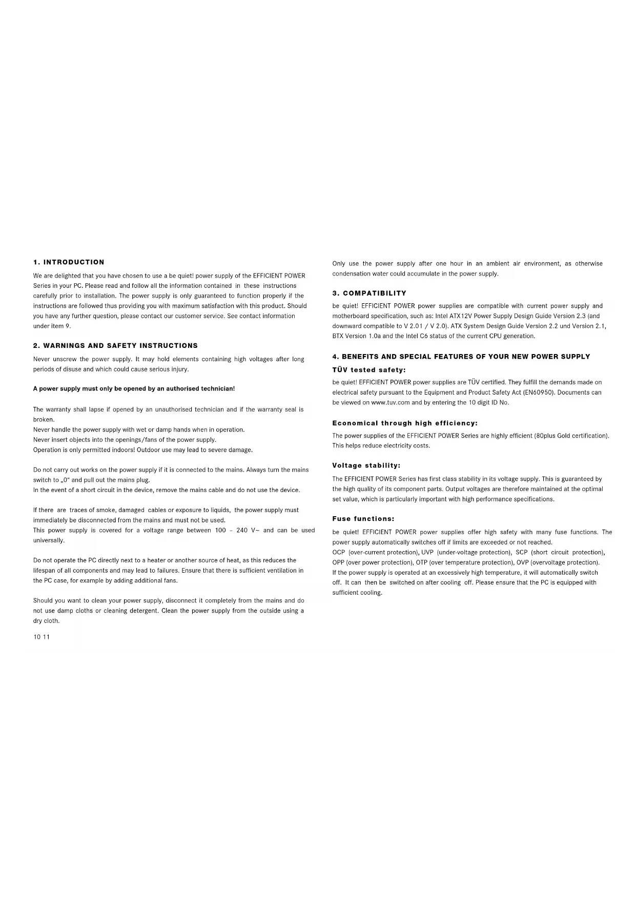 We are delighted that you have chosen to use a be quiet! power supply of the EFFICIENT POWER Series in your PC. Please read and follow all the information contained in these instructions carefully prior to installation. The power supply is only guaranteed to function properly if the instructions are followed thus providing you with maximum satisfaction with this product. Should you have any further question, please contact our customer service. See contact information under item 9.