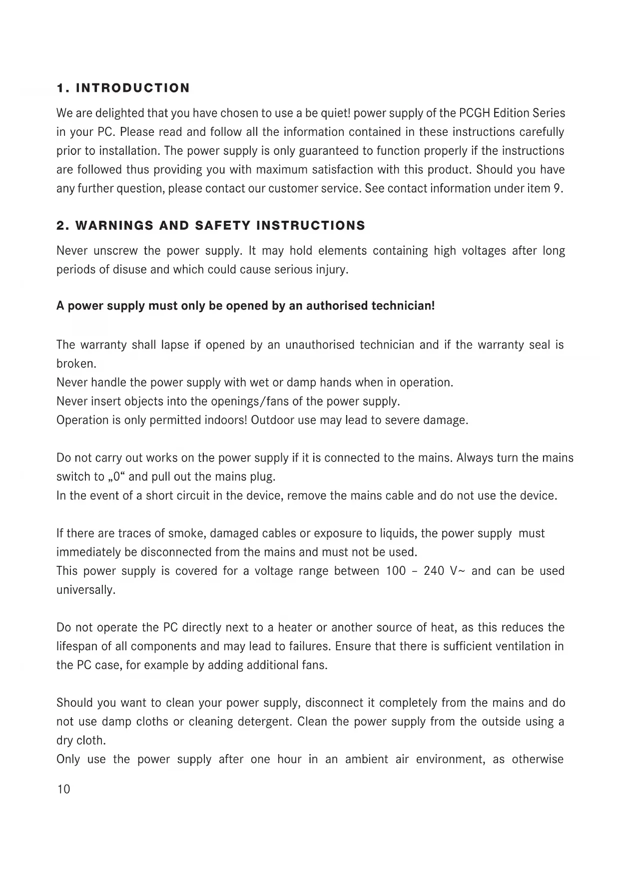 We are delighted that you have chosen to use a be quiet! power supply of the PCGH Edition Series in your PC. Please read and follow all the information contained in these instructions carefully prior to installation. The power supply is only guaranteed to function properly if the instructions are followed thus providing you with maximum satisfaction with this product. Should you have any further question, please contact our customer service. See contact information under item 9.
