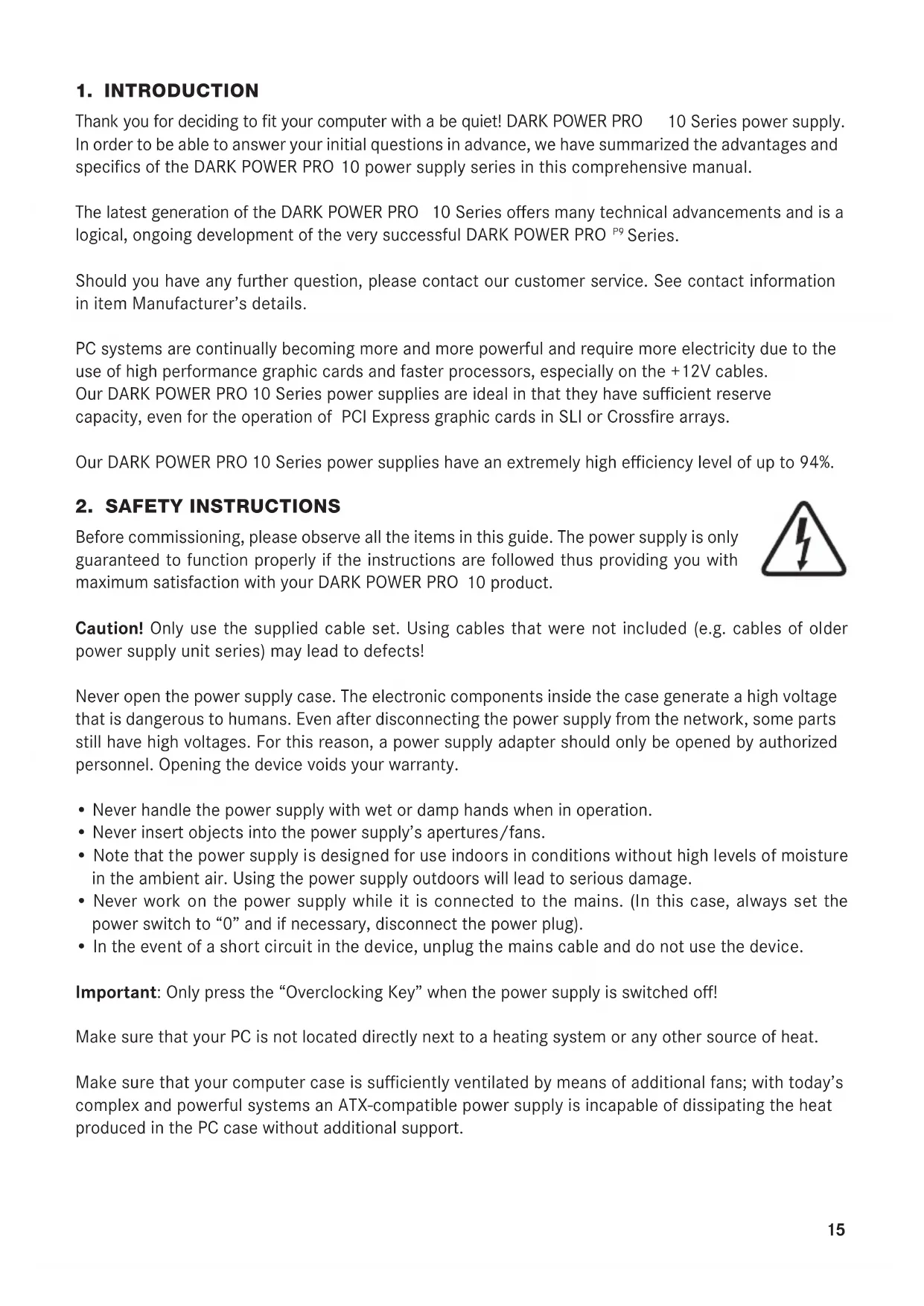 Before commissioning, please observe all the items in this guide. The power supply is only guaranteed to function properly if the instructions are followed thus providing you with maximum satisfaction with your DARK POWER PRO 10 product.