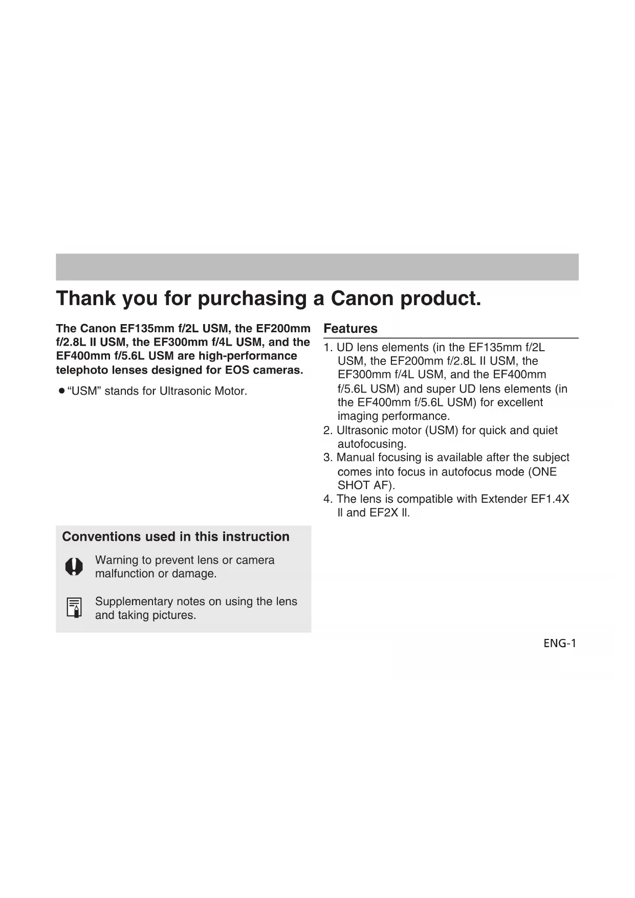*2,3) EF200mm f/2.8L II USM • EF300mm f/4L USM • EF400mm f/5.6L USM For detailed information, reference page numbers are provided in parentheses (→ **).ENG-4