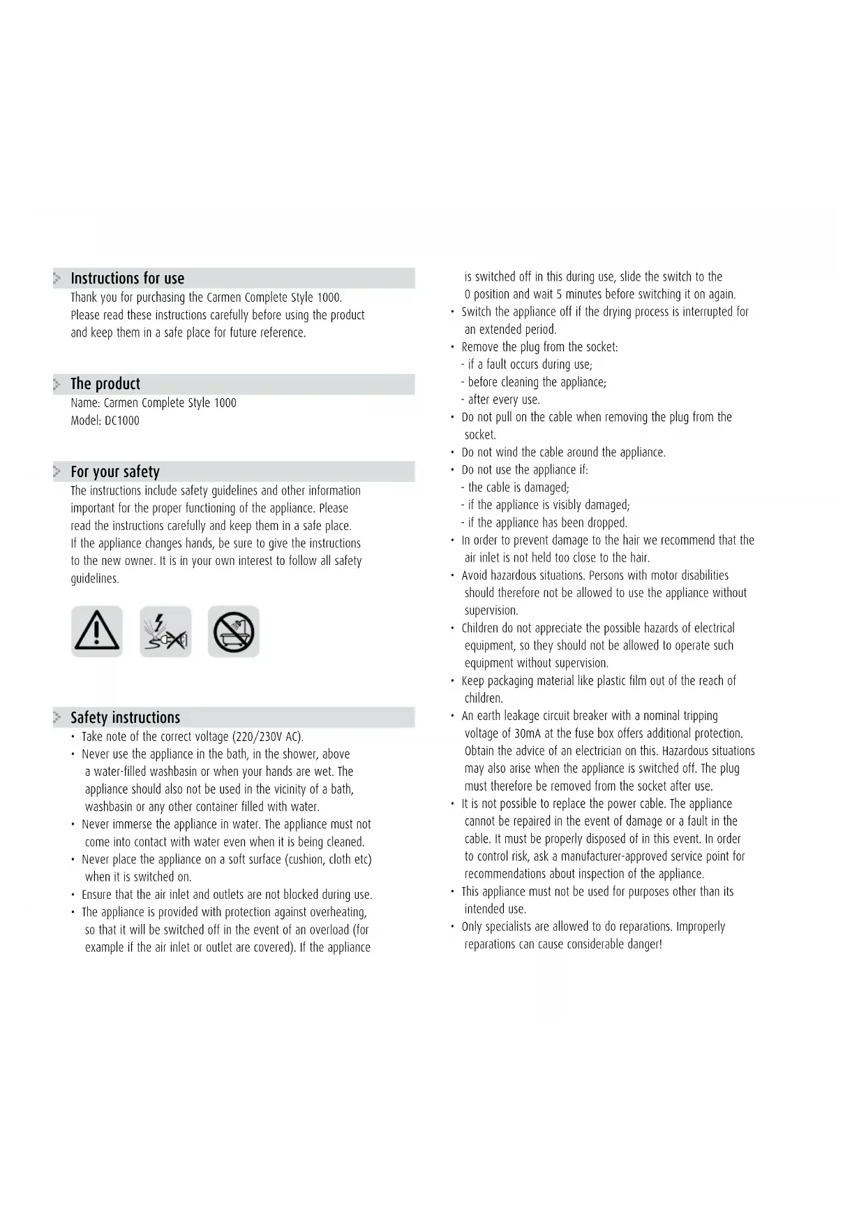 Thank you for purchasing the Carmen Complete Style 1000. Please read these instructions carefully before using the product and keep them in a safe place for future reference.