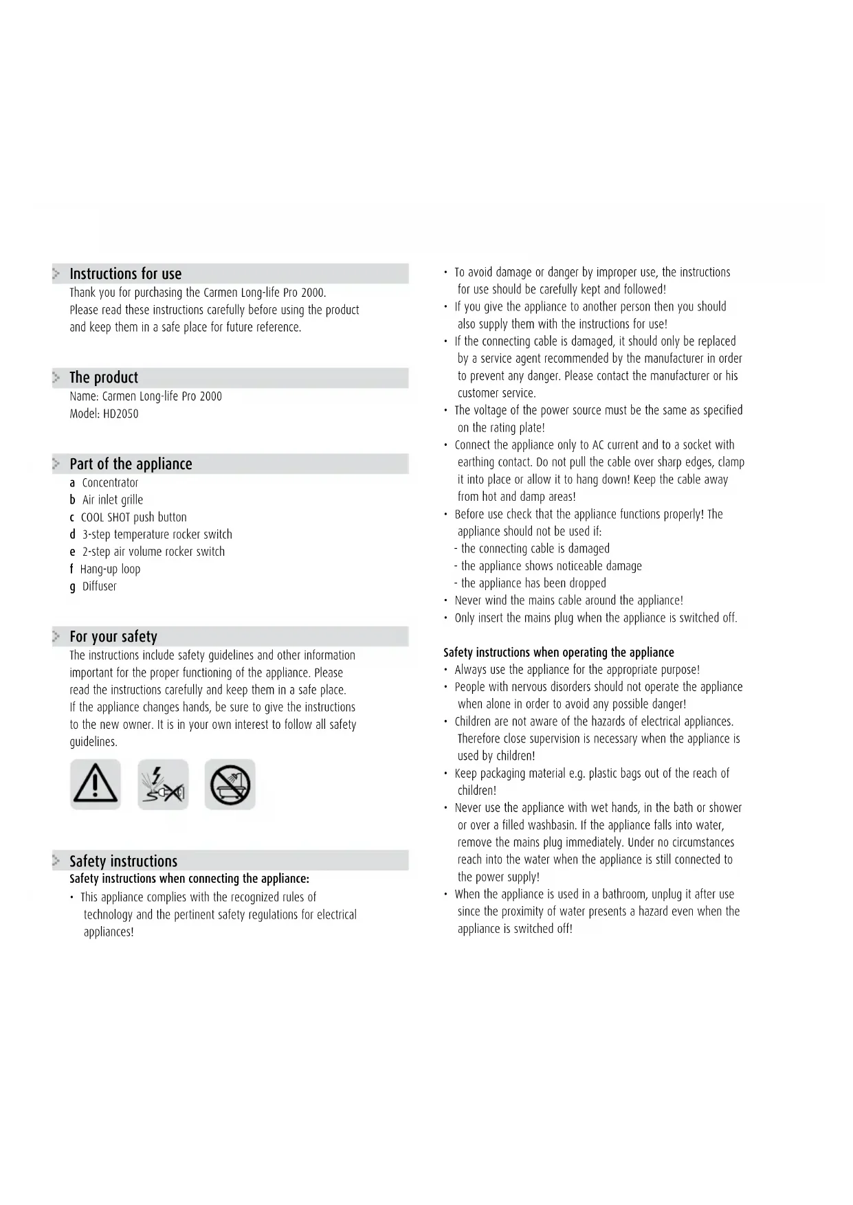 Download the instructions for your Hair dryer in PDF format for free! Find your manual HD2050 - Carmen and take your electronic device back in hand. On this page are published all the documents necessary for the use of your device. HD2050 by Carmen.