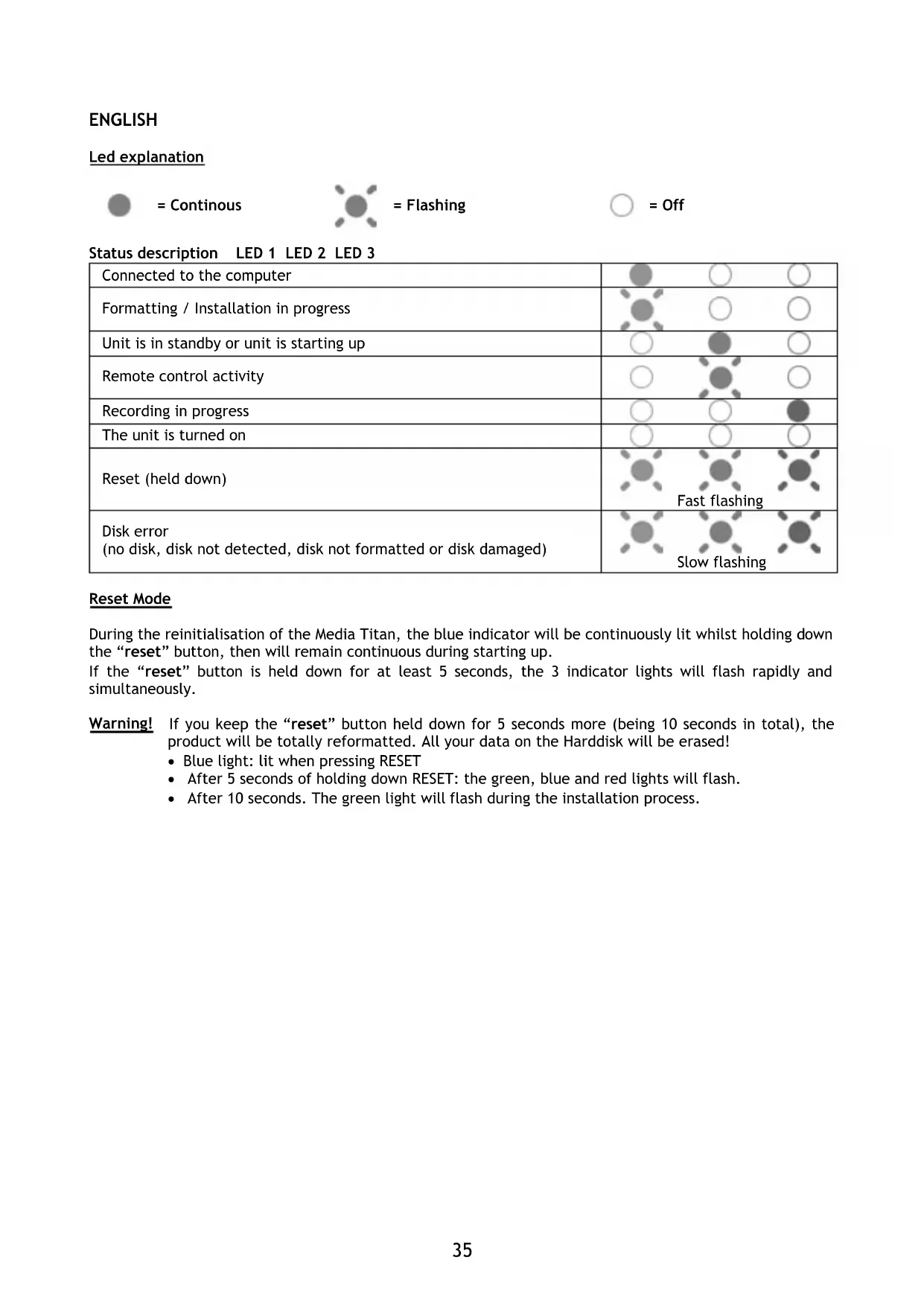 During the reinitialisation of the Media Titan, the blue indicator will be continuously lit whilst holding down