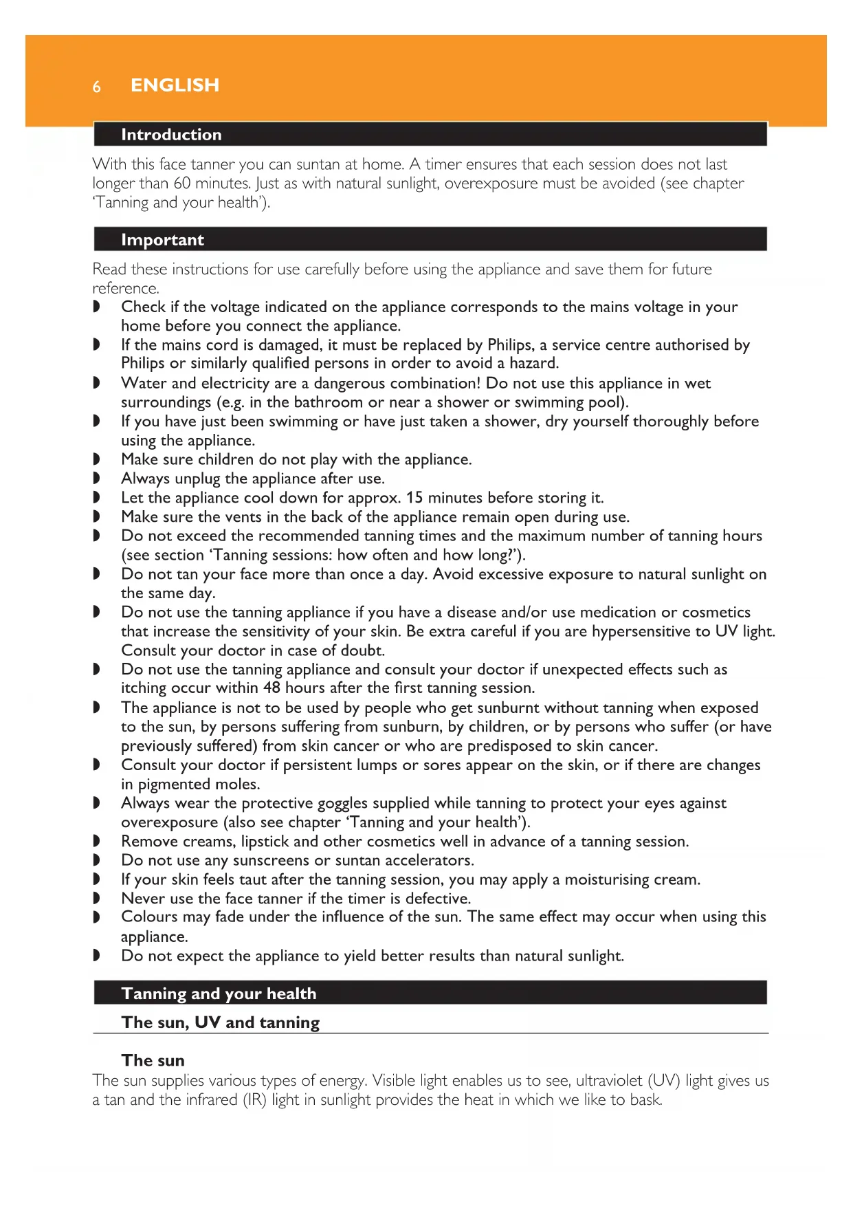 that you follow the instructions in chapter ‘Important’ and section ‘Tanning sessions: how often