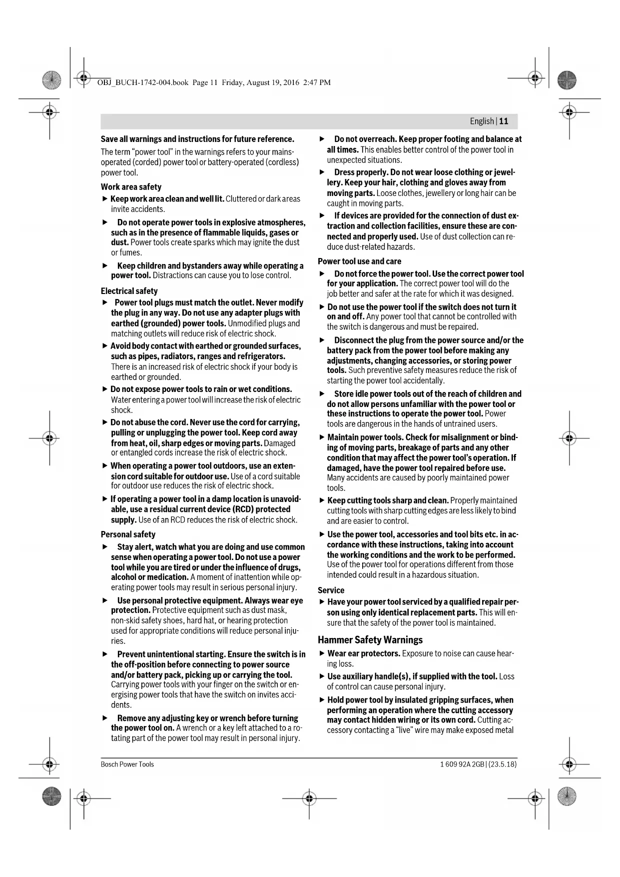 Weight according to EPTA-Procedure 01:2014 kg 6.8 Protection class /II The values given are valid for a nominal voltage [U] of 230 V. For differ- ent voltages and models for specific countries, these values can vary. OBJ_BUCH-1742-004.book Page 12 Friday, August 19, 2016 2:47 PMEnglish | 13 Bosch Power Tools 1 609 92A 2GB | (23.5.18) when it is running but not actually doing the job. This may sig- nificantly reduce the exposure level over the total working period. Identify additional safety measures to protect the operator from the effects of vibration such as: maintain the tool and the accessories, keep the hands warm, organisation of work pat- terns. Assembly Before any work on the machine itself, pull the mains plug. Auxiliary Handle Operate your machine only with the auxiliary handle