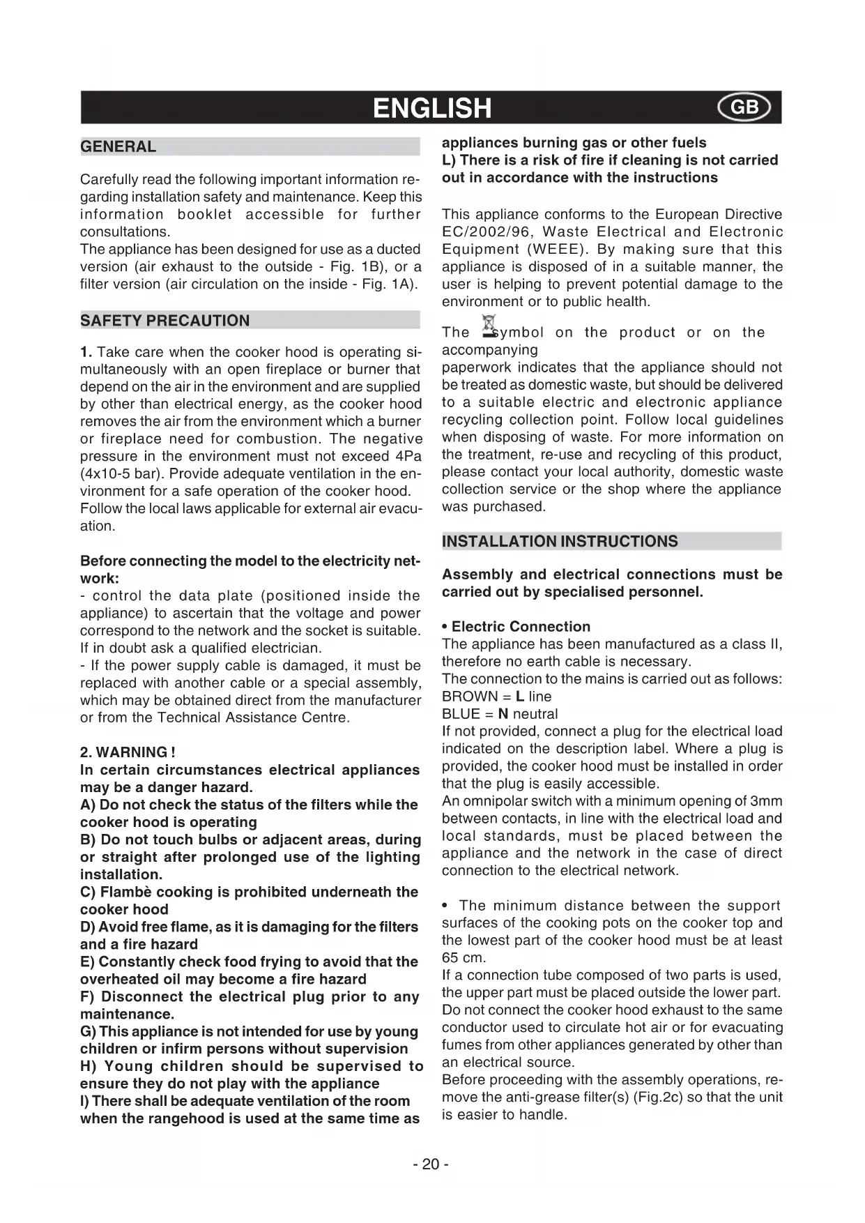 - The minimum distance between the support surfaces of the cooking pots on the cooker top and the lowest part of the cooker hood must be at least 65 cm. If a connection tube composed of two parts is used, the upper part must be placed outside the lower part. Do not connect the cooker hood exhaust to the same conductor used to circulate hot air or for evacuating fumes from other appliances generated by other than an electrical source. Before proceeding with the assembly operations, re- move the anti-grease filter(s) (Fig.2c) so that the unit is easier to handle. ENGLISH GB- 21 - In the case of assembly of the appliance in the suction version prepare the hole for evacuation of the air.