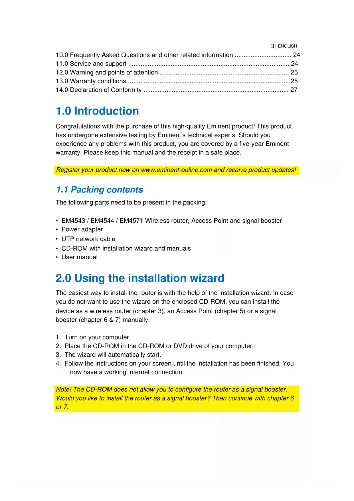 The easiest way to install the router is with the help of the installation wizard. In case you do not want to use the wizard on the enclosed CD-ROM, you can install the device as a wireless router (chapter 3), an Access Point (chapter 5) or a signal booster (chapter 6 & 7) manually.