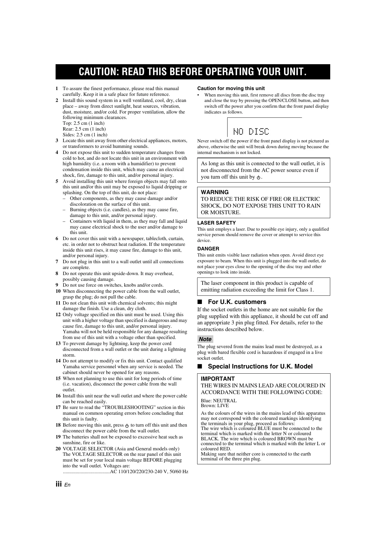 DANGER This unit emits visible laser radiation when open. Avoid direct eye exposure to beam. When this unit is plugged into the wall outlet, do not place your eyes close to the opening of the disc tray and other openings to look into inside.
