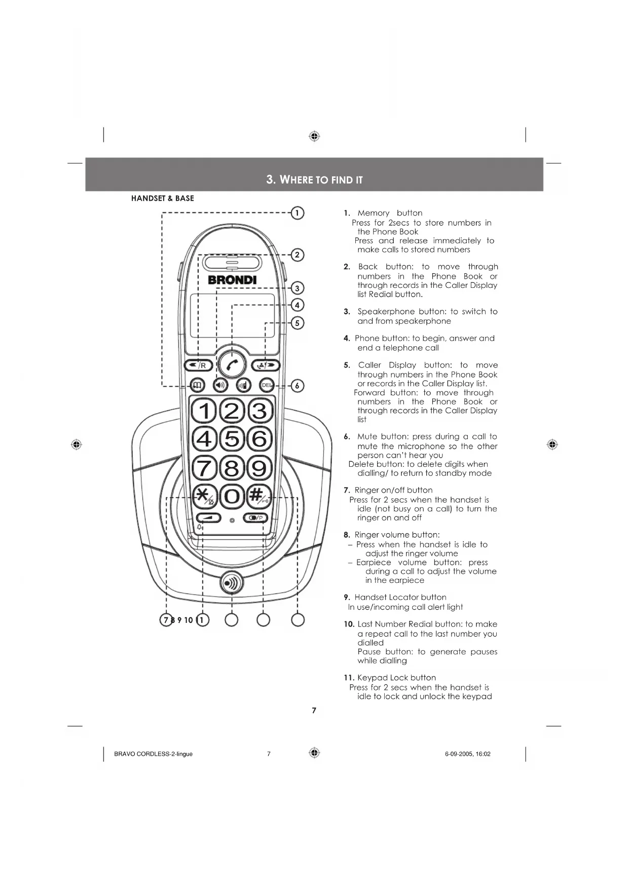 BEDIENUNGSANLEITUNG BRAVO CORDLESS-2-lingue 6-09-2005, 16:021ENGLISH 3 ESPAÑOL 19 FRANÇAIS 37 DEUTSCH 55 BRAVO CORDLESS-2-lingue 6-09-2005, 16:022Congratulations for choosing BRAVO CORDLESS 2, Brondi’s DECT GAP cordless. This telephone which features big keys and big numbers on a light display will make it easier for you to make telephone calls. BRAVO CORDLESS 2 is provided with speakerphone and allows you to adjust the earpiece volume. For further details on this product, please check this instruction manual. BRAVO CORDLESS 2