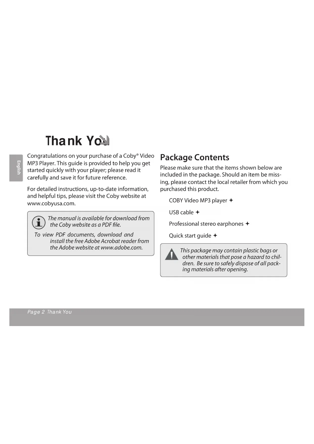 Congratulations on your purchase of a Coby® Video MP3 Player. This guide is provided to help you get started quickly with your player; please read it carefully and save it for future reference.