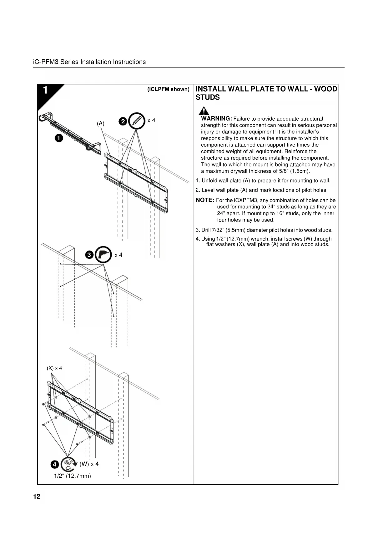 serious personal injury or damage to equipment! It is the installer’s responsibility to make sure the combined weight of all components attached does not exceed 125 lbs (56.7 kg) for the iCMPFM3 and iCLPFM3 or 175 lbs (79.4 kg) for the iCXPFM3. Use with products heavier than the maximum weight indicated may result in collapse of the mount and its accessories causing possible injury.