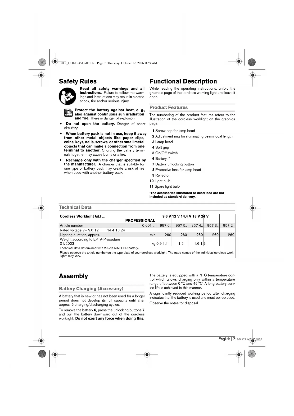 - Insert the protective lens 8 into the screw cap 1 and screw the screw cap onto the lamp head 3. Ensure that all parts are properly seated. Operation Starting Operation Inserting the Battery f Use only original Bosch O-pack batteries with the voltage given on the type plate of your cordless worklight. Usage of other batteries can cause injuries and lead to danger of fire. Insert the charged battery 6 into the handle until it can be felt to engage and faces flush against the handle. Switching On and Off To switch the cordless worklight on, press the On/Off switch 5 upward. To switch the cordless worklight off, press the On/Off switch 5 downward. Changing the Position of the Reflector The lamp head 3 can be swivelled upward to a maxi- mum of 90° by turning in anticlockwise direction. Changing the Illuminating Beam/Focal Length By turning the adjustment ring 2, the illuminating beam as well as the focal length of the reflector can be changed. Operating Instructions At low temperatures, the luminous efficiency may be lower and the lighting duration shorter. When using Bosch NiMH batteries, the performance capability is limited at temperatures below – 10 °C. Soft Grip The gripping surface 4 (soft grip) reduces the danger of slipping and thereby improves the grip on the cord- less worklight and the handling. OBJ_DOKU-4516-001.fm Page 8 Thursday, October 12, 2006 8:59 AMEnglish | 91 609 929 K47 • 12.10.06 Maintenance and Service Maintenance and Cleaning If the cordless worklight should fail despite the care taken in manufacturing and testing procedures, repair should be carried out by an authorized after-sales serv- ice agent for Bosch power tools. In all correspondence and spare parts orders, please always include the 10-digit article number given on the nameplate of the cordless worklight. Service and Customer Assistance Exploded views and information on spare parts can be found under: www.bosch-pt.com Great Britain Robert Bosch Ltd. (B.S.C.) P.O. Box 98 Broadwater Park North Orbital Road Denham-Uxbridge Middlesex UB 9 5HJ ✆ Service: . . . . . . . . . . . . . . +44 (0) 18 95 / 83 87 82 ✆ Advice line:. . . . . . . . . . . . +44 (0) 18 95 / 83 87 91 Fax: . . . . . . . . . . . . . . . . . . . . +44 (0) 18 95 / 83 87 89 Ireland Origo Ltd. Unit 23 Magna Drive Magna Business Park City West Dublin 24 ✆ Service: . . . . . . . . . . . . . . . .+353 (0)1 / 4 66 67 00 Fax: . . . . . . . . . . . . . . . . . . . . . .+353 (0)1 / 4 66 68 88 Australia and New Zealand Robert Bosch Australia Pty. Ltd. RBAU/SPT 1555 Centre Road P.O. Box 66 3168 Clayton/Victoria ✆ . . . . . . . . . . . . . . . . . . . . . +61 (0)1 / 3 00 30 70 44 Fax: . . . . . . . . . . . . . . . . . . . . +61 (0)1 / 3 00 30 70 45 www.bosch.com.au Disposal Cordless worklights, accessories and packaging should be sorted for environmental-friendly recycling. Only for EC countries: Do not dispose of cordless worklights into household waste! According to the European Directive 2002/96/EC on waste electrical and electronic equipment and its incorpora- tion into national law, cordless work- lights that are no longer suitable for use must be separately collected and sent for recovery in an envi- ronmental-friendly manner. Battery packs/batteries: Ni-Cd: Nickel cadmium