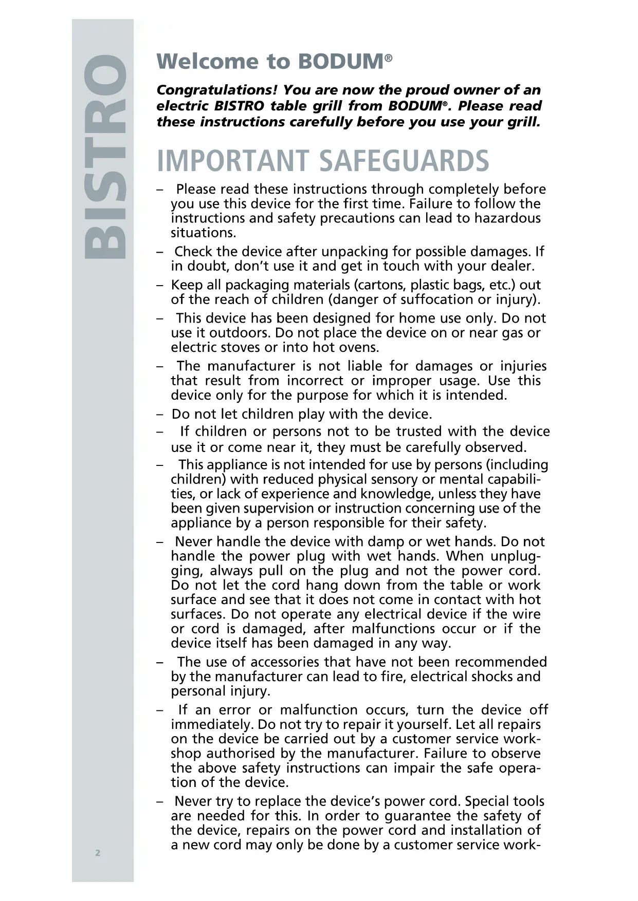 Congratulations! You are now the proud owner of an electric BISTRO table grill from BODUM®. Please read these instructions carefully before you use your grill.