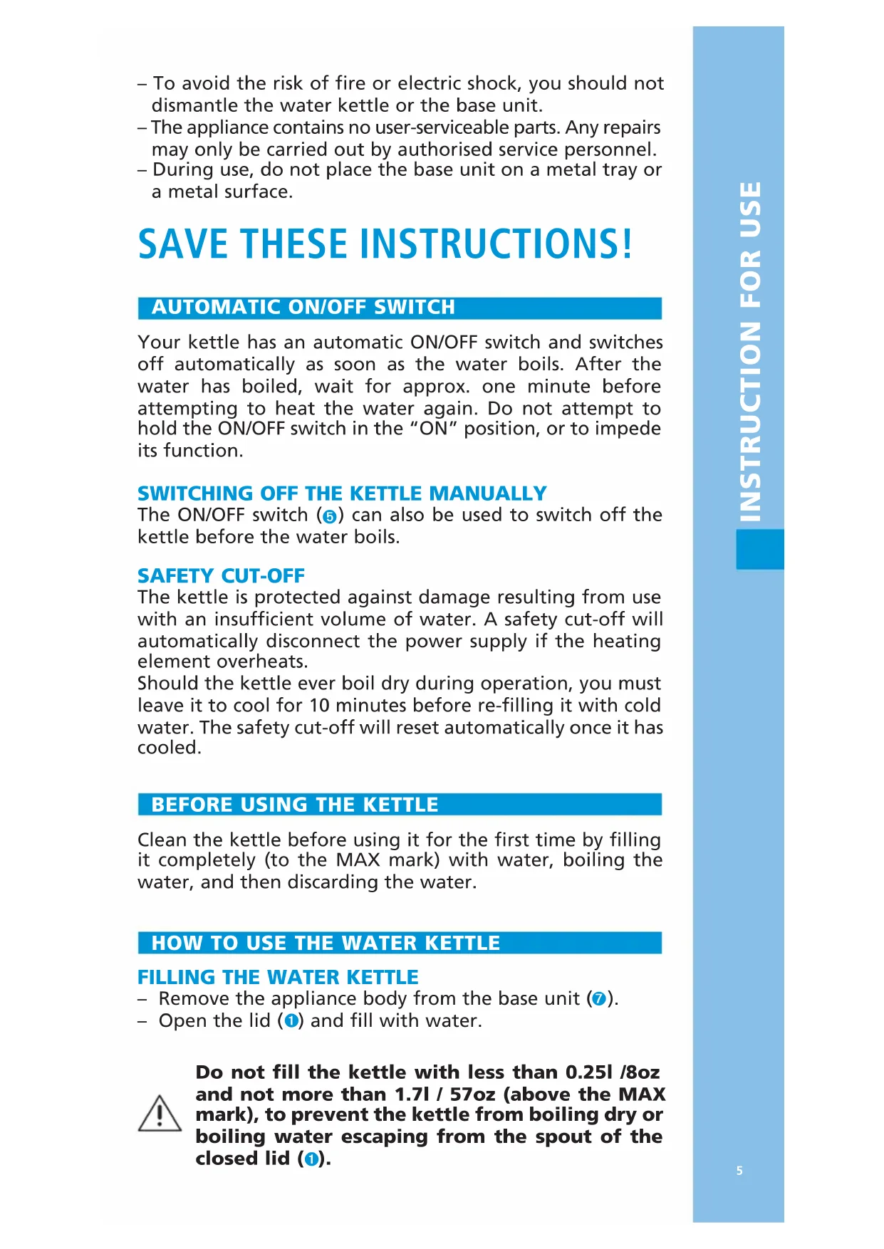 – To avoid the risk of fire or electric shock, you should not dismantle the water kettle or the base unit. – The appliance contains no user-serviceable parts. Any repairs may only be carried out by authorised service personnel. – During use, do not place the base unit on a metal tray or a metal surface. SAVE THESE INSTRUCTIONS! SPECIAL INSTRUCTIONS