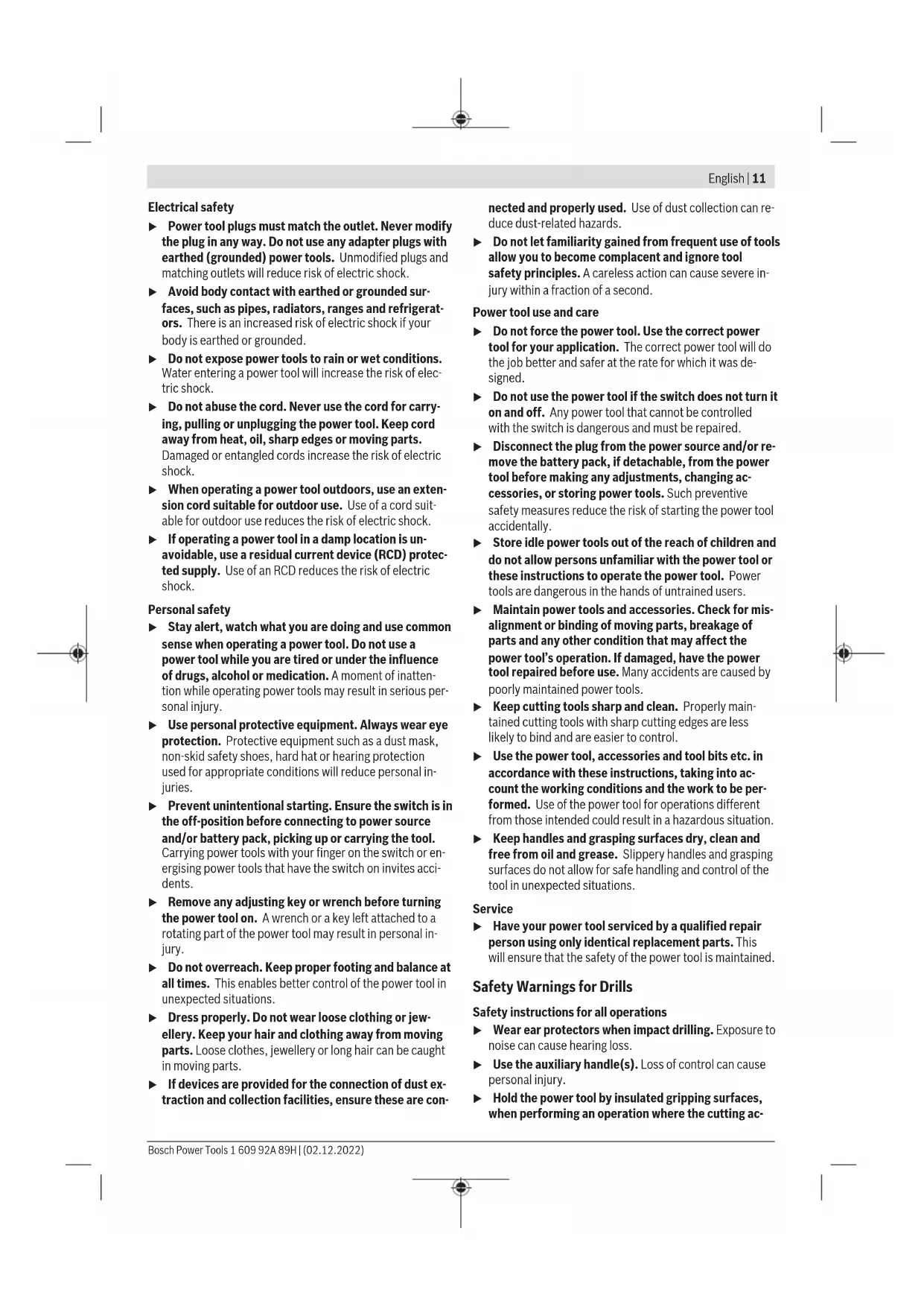 äußeren Abmessung größer als 25cm sind, im Einzel- handelsgeschäft oder in unmittelbarer Nähe hierzu un- entgeltlich zurückzunehmen; die Rücknahme darf nicht an den Kauf eines Elektro- oder Elektronikgerätes ge- knüpft werden und ist auf drei Altgeräte pro Geräteart beschränkt. Der Vertreiber hat beim Abschluss des Kaufvertrags für das neue Elektro- oder Elektronikgerät den Endnutzer über die Möglichkeit zur unentgeltlichen Rückgabe bzw. Abholung des Altgeräts zu informieren und den Endnutzer nach seiner Absicht zu befragen, ob bei der Auslieferung des neuen Ge- räts ein Altgerät zurückgegeben wird. Dies gilt auch bei Vertrieb unter Verwendung von Fernkom- munikationsmitteln, wenn die Lager- und Versandflächen für Elektro- und Elektronikgeräte mindestens 400m² betragen oder die gesamten Lager- und Versandflächen mindestens 800m² betragen, wobei die unentgeltliche Abholung auf Elektro- und Elektronikgeräte der Kategorien 1 (Wärmeüber- träger), 2 (Bildschirmgeräte) und 4 (Großgeräte mit mindes- tens einer äußeren Abmessung über 50cm) beschränkt ist. Für alle übrigen Elektro- und Elektronikgeräte muss der Ver- treiber geeignete Rückgabemöglichkeiten in zumutbarer Ent- fernung zum jeweiligen Endnutzer gewährleisten; das gilt auch für Altgeräte, die in keiner äußeren Abmessung größer als 25cm sind, die der Endnutzer zurückgeben will, ohne ein neues Gerät zu kaufen. English Safety Instructions General Power Tool Safety Warnings WARNING Read all safety warnings, instruc- tions, illustrations and specifica- tions provided with this power tool. Failure to follow all in- structions listed below may result in electric shock, fire and/ or serious injury. Save all warnings and instructions for future reference. The term "power tool" in the warnings refers to your mains- operated (corded) power tool or battery-operated (cord- less) power tool. Work area safety u Keep work area clean and well lit. Cluttered or dark areas invite accidents. u Do not operate power tools in explosive atmospheres, such as in the presence of flammable liquids, gases or dust. Power tools create sparks which may ignite the dust or fumes. u Keep children and bystanders away while operating a power tool. Distractions can cause you to lose control. 1 609 92A 89H | (02.12.2022) Bosch Power ToolsEnglish | 11 Electrical safety u Power tool plugs must match the outlet. Never modify the plug in any way. Do not use any adapter plugs with earthed (grounded) power tools. Unmodified plugs and matching outlets will reduce risk of electric shock. u Avoid body contact with earthed or grounded sur- faces, such as pipes, radiators, ranges and refrigerat- ors. There is an increased risk of electric shock if your body is earthed or grounded. u Do not expose power tools to rain or wet conditions. Water entering a power tool will increase the risk of elec- tric shock. u Do not abuse the cord. Never use the cord for carry- ing, pulling or unplugging the power tool. Keep cord away from heat, oil, sharp edges or moving parts. Damaged or entangled cords increase the risk of electric shock. u When operating a power tool outdoors, use an exten- sion cord suitable for outdoor use. Use of a cord suit- able for outdoor use reduces the risk of electric shock. u If operating a power tool in a damp location is un- avoidable, use a residual current device (RCD) protec- ted supply. Use of an RCD reduces the risk of electric shock. Personal safety u Stay alert, watch what you are doing and use common sense when operating a power tool. Do not use a power tool while you are tired or under the influence of drugs, alcohol or medication. A moment of inatten- tion while operating power tools may result in serious per- sonal injury. u Use personal protective equipment. Always wear eye protection. Protective equipment such as a dust mask, non-skid safety shoes, hard hat or hearing protection used for appropriate conditions will reduce personal in- juries. u Prevent unintentional starting. Ensure the switch is in the off-position before connecting to power source and/or battery pack, picking up or carrying the tool. Carrying power tools with your finger on the switch or en- ergising power tools that have the switch on invites acci- dents. u Remove any adjusting key or wrench before turning the power tool on. A wrench or a key left attached to a rotating part of the power tool may result in personal in- jury. u Do not overreach. Keep proper footing and balance at all times. This enables better control of the power tool in unexpected situations. u Dress properly. Do not wear loose clothing or jew- ellery. Keep your hair and clothing away from moving parts. Loose clothes, jewellery or long hair can be caught in moving parts. u If devices are provided for the connection of dust ex- traction and collection facilities, ensure these are con- nected and properly used. Use of dust collection can re- duce dust-related hazards. u Do not let familiarity gained from frequent use of tools allow you to become complacent and ignore tool safety principles. A careless action can cause severe in- jury within a fraction of a second. Power tool use and care u Do not force the power tool. Use the correct power tool for your application. The correct power tool will do the job better and safer at the rate for which it was de- signed. u Do not use the power tool if the switch does not turn it on and off. Any power tool that cannot be controlled with the switch is dangerous and must be repaired. u Disconnect the plug from the power source and/or re- move the battery pack, if detachable, from the power tool before making any adjustments, changing ac- cessories, or storing power tools. Such preventive safety measures reduce the risk of starting the power tool accidentally. u Store idle power tools out of the reach of children and do not allow persons unfamiliar with the power tool or these instructions to operate the power tool. Power tools are d