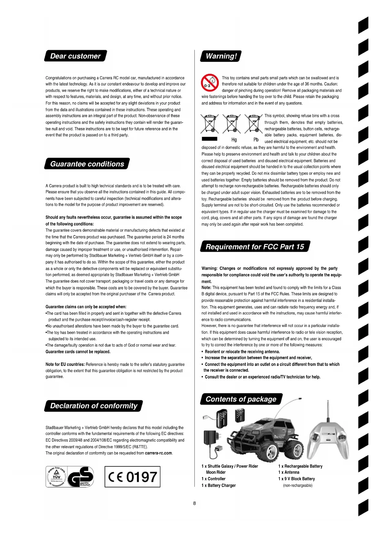 - The damage/faulty operation is not due to acts of God or normal wear and tear. Guarantee cards cannot be replaced. Note for EU countries: Reference is hereby made to the seller’s statutory guarantee obligation, to the extent that this guarantee obligation is not restricted by the product guarantee. Declaration of conformity Stadlbauer Marketing + Vertrieb GmbH hereby declares that this model including the controller conforms with the fundamental requirements of the following EC directives: EC Directives 2009/48 and 2004/108/EC regarding electromagnetic compatibility and the other relevant regulations of Directive 1999/5/EC (R&TTE). The original declaration of conformity can be requested from carrerarc.com. Warning! This toy contains small parts small parts which can be swallowed and is therefore not suitable for children under the age of 36 months. Caution: danger of pinching during operation! Remove all packaging materials and wire fastenings before handing the toy over to the child. Please retain the packaging and address for information and in the event of any questions. This symbol, showing refuse bins with a cross through them, denotes that empty batteries, rechargeable batteries, button cells, recharge- able battery packs, equipment batteries, dis- used electrical equipment, etc. should not be disposed of in domestic refuse, as they are harmful to the environment and health. Please help to preserve environment and health and talk to your children about the correct disposal of used batteries and disused electrical equipment. Batteries and disused electrical equipment should be handed in to the usual collection points where they can be properly recycled. Do not mix dissimilar battery types or employ new and used batteries together. Empty batteries should be removed from the product. Do not attempt to recharge non-rechargeable batteries. Rechargeable batteries should only be charged under adult super vision. Exhausted batteries are to be removed from the toy. Rechargeable batteries should be removed from the product before charging. Supply terminal are not to be short-circuited. Only use the batteries recommended or equivalent types. If in regular use the charger must be examined for damage to the cord, plug, covers and all other parts. If any signs of damage are found the charger may only be used again after repair work has been completed. Requirement for FCC Part 15