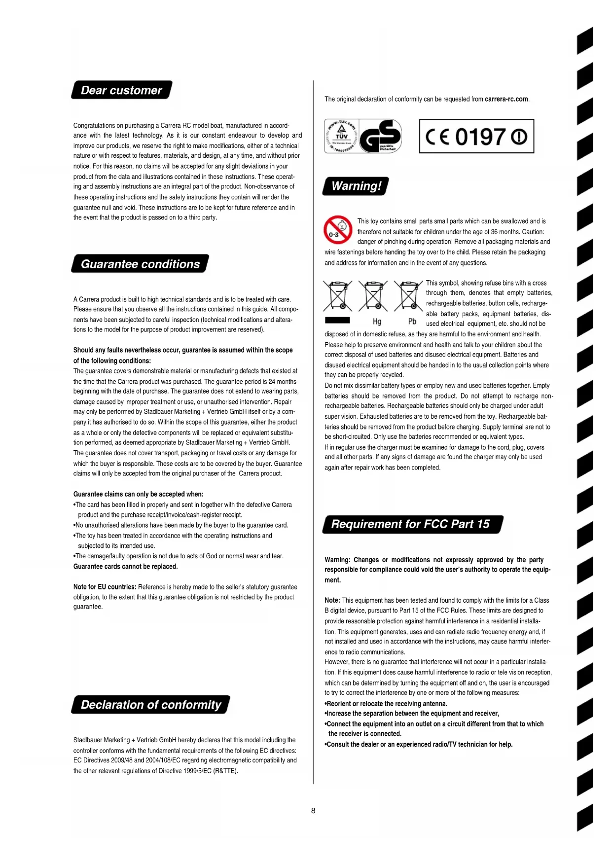 - The damage/faulty operation is not due to acts of God or normal wear and tear. Guarantee cards cannot be replaced. Note for EU countries: Reference is hereby made to the seller’s statutory guarantee obligation, to the extent that this guarantee obligation is not restricted by the product guarantee. Declaration of conformity Stadlbauer Marketing + Vertrieb GmbH hereby declares that this model including the controller conforms with the fundamental requirements of the following EC directives: EC Directives 2009/48 and 2004/108/EC regarding electromagnetic compatibility and the other relevant regulations of Directive 1999/5/EC (R&TTE). The original declaration of conformity can be requested from carrerarc.com. Warning! This toy contains small parts small parts which can be swallowed and is therefore not suitable for children under the age of 36 months. Caution: danger of pinching during operation! Remove all packaging materials and wire fastenings before handing the toy over to the child. Please retain the packaging and address for information and in the event of any questions. This symbol, showing refuse bins with a cross through them, denotes that empty batteries, rechargeable batteries, button cells, recharge- able battery packs, equipment batteries, dis- used electrical equipment, etc. should not be disposed of in domestic refuse, as they are harmful to the environment and health. Please help to preserve environment and health and talk to your children about the correct disposal of used batteries and disused electrical equipment. Batteries and disused electrical equipment should be handed in to the usual collection points where they can be properly recycled. Do not mix dissimilar battery types or employ new and used batteries together. Empty batteries should be removed from the product. Do not attempt to recharge non- rechargeable batteries. Rechargeable batteries should only be charged under adult super vision. Exhausted batteries are to be removed from the toy. Rechargeable bat- teries should be removed from the product before charging. Supply terminal are not to be short-circuited. Only use the batteries recommended or equivalent types. If in regular use the charger must be examined for damage to the cord, plug, covers and all other parts. If any signs of damage are found the charger may only be used again after repair work has been completed. Requirement for FCC Part 15