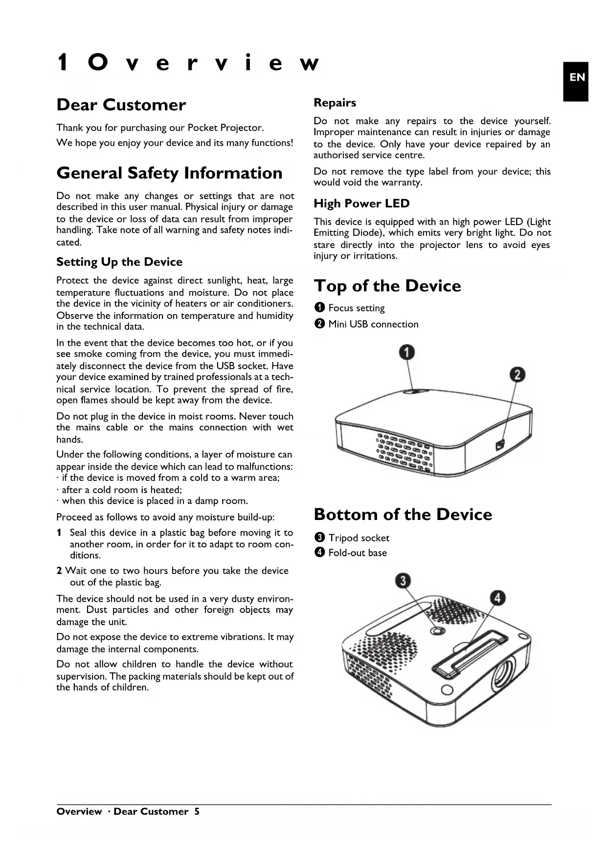 1Overview Dear Customer Thank you for purchasing our Pocket Projector. We hope you enjoy your device and its many functions! General Safety Information Introduction 2 Do not make any changes or settings that are not described in this user manual. Physical injury or damage to the device or loss of data can result from improper handling. Take note of all warning and safety notes indi- cated. Setting Up the Device Protect the device against direct sunlight Protect the device against direct sunlight, heat, large temperature fluctuations and moisture. Do not place the device in the vicinity of heaters or air conditioners. Observe the information on temperature and humidity in the technical data. In the event that the device becomes too hot, or if you see smoke coming from the device (USB) In the event that the device becomes too hot, or if you see smoke coming from the device, you must immedi- ately disconnect the device from the USB socket. Have your device examined by trained professionals at a tech- nical service location. To prevent the spread of fire, open flames should be kept away from the device. Do not plug in the device in moist rooms. Do not plug in the device in moist rooms. Never touch the mains cable or the mains connection with wet hands. Moisture build-up Under the following conditions, a layer of moisture can appear inside the device which can lead to malfunctions: