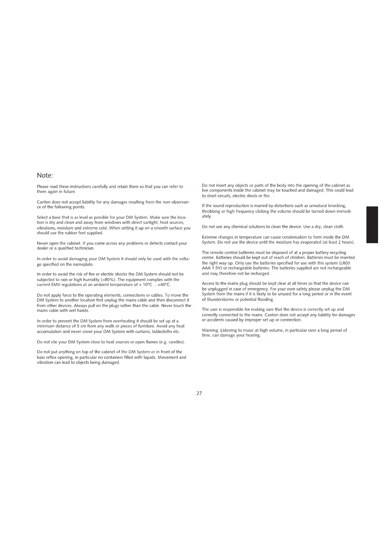 time, can damage your hearing.28 System description The virtual surround system of the DM Series creates a rich and full sound field that is normally only possible with 5.1 Systems. To achieve this sound quality the individual channels of a multi-channel recording are put through a special frequency-specific process and mixed onto two channels, which then creates the impression of surround sound in the room. The result is outstanding listening pleasure for minimum installation costs. The systems have an integrated, RDS-enabled FM Tuner and adaptive remote control, which can be used to control a second listening zone (Multiroom). Dear Customer, Welcome to the Canton family and thank you for the confidence you have shown in us with the purchase of this system. You have selected a high quali- ty loudspeaker system, which shows that you have high standards regarding sound quality and workmanship. Please read through these instructions carefully before setting up and connecting your DM System. They are designed to help you to get the most out of your system. The Canton distribution network covers over 40 countries. If you have any questions our team of experienced distributors along with the authorised dealers will be happy to help you. We hope that you get many long hours of pleasure and satisfaction from your DM System. The Canton team29 DeutschEnglish FrançaisEspagnol Package contents DM 90.2 The Digital Movie System DM 90.2 is supplied with the following components: