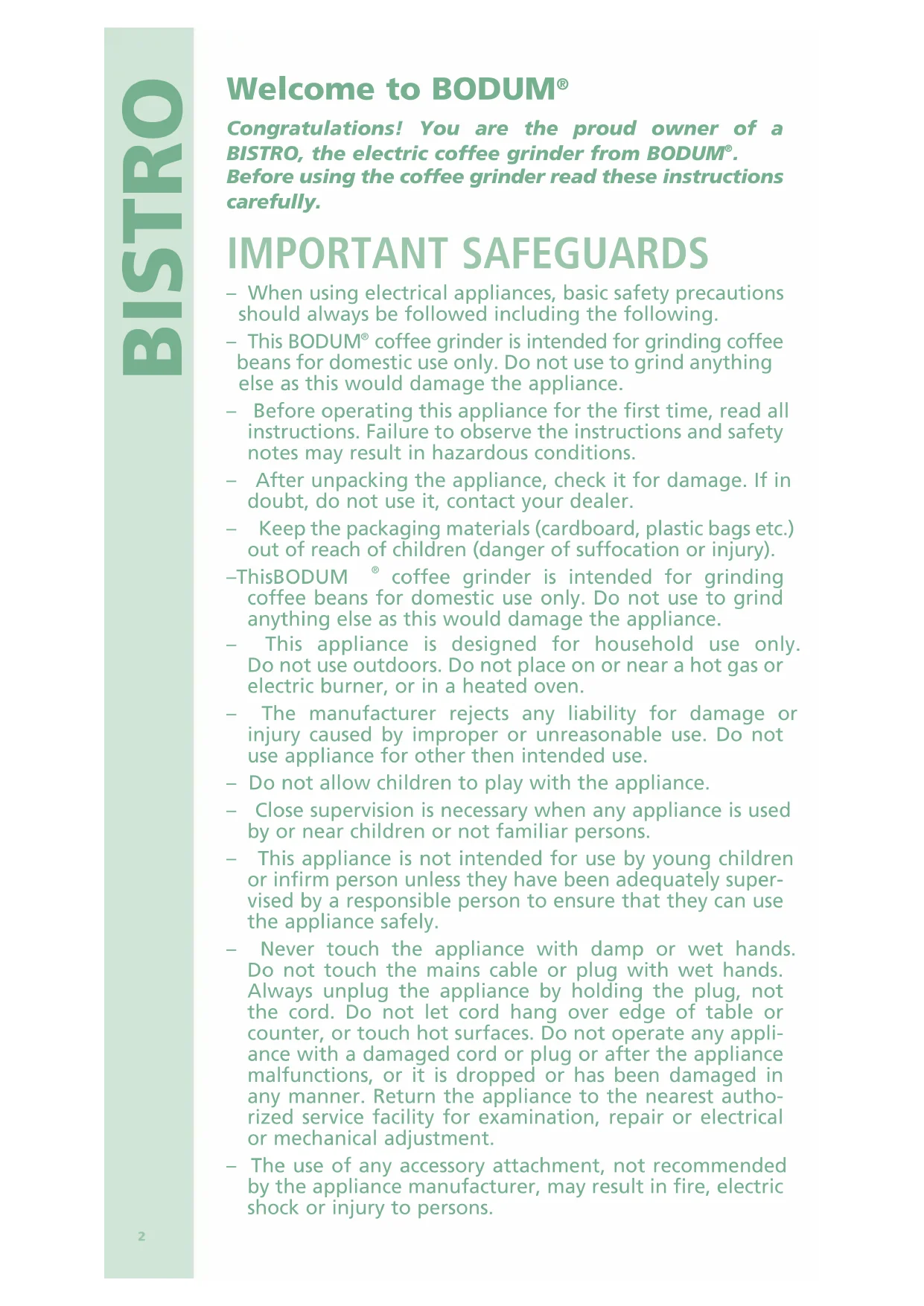 Before using the coffee grinder read these instructions carefully. IMPORTANT SAFEGUARDS – When using electrical appliances, basic safety precautions should always be followed including the following.쀀 – This BODUM