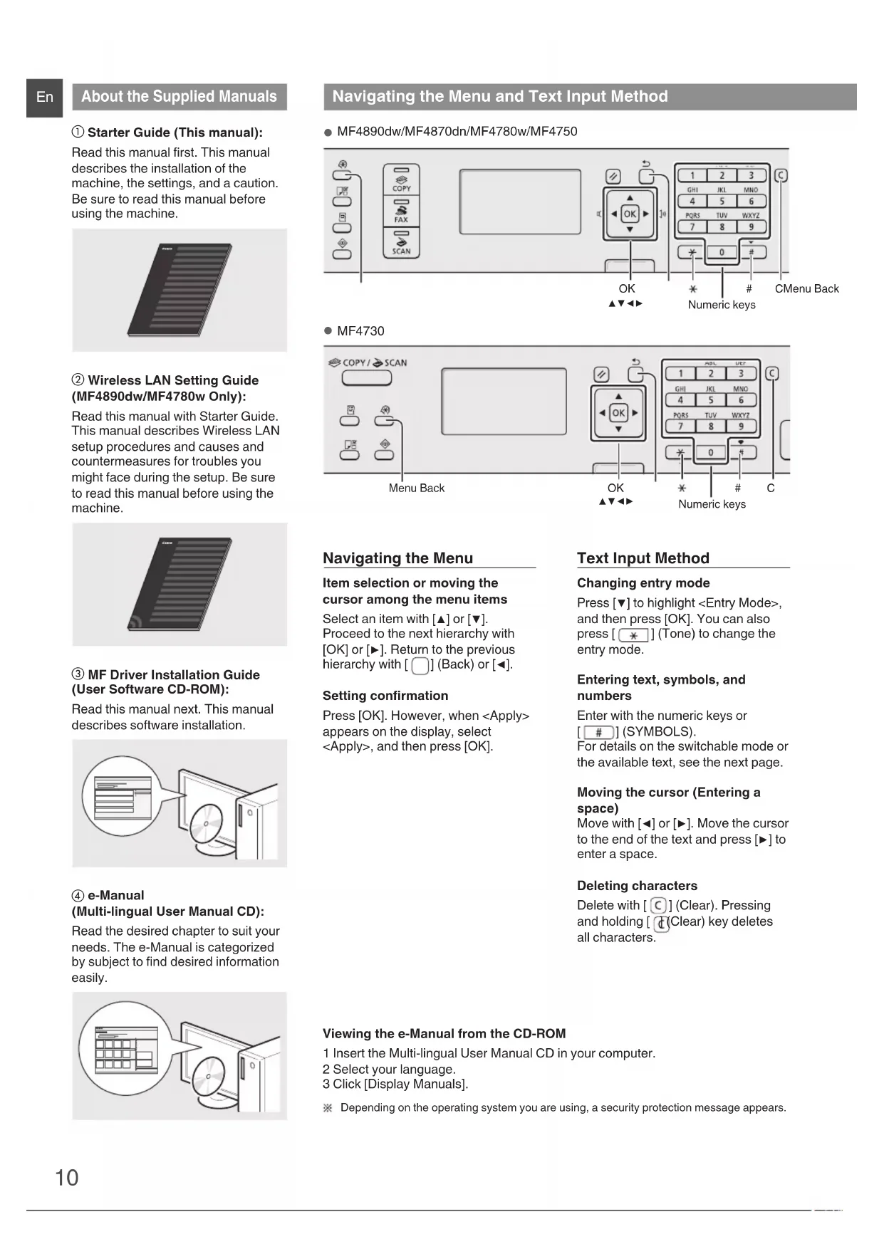 Text Input Method” ( P.10). ● MF4890dw/MF4780w Language Czech Danish Dutch EnglishUse wireless LAN to connect computer?(Can config. later.)NoYesCurrent Time set. Must rechg. battery for 24 hrs. to save time settings. After turning main ● Connect to the computer via a wired LAN Proceed to “Connecting via a Wired LAN (MF4890dw/MF4870dn/MF4780w Only)” (P.12). ● Connect to the computer via a USB cable Proceed to “Connecting via a USB Cable” (P.12). ● Do not connect to PC Proceed to “Specifying Initial Fax Settings and Connecting a Telephone Cable (MF4890dw/MF4870dn/MF4780w/MF4750 Only)” (P.13). ● MF4870dn/MF4750/MF4730 Language Czech Danish Dutch EnglishCopy: Press Start100% A4 Density: 0 Original Type: Text ... 2-Sided: Off 1