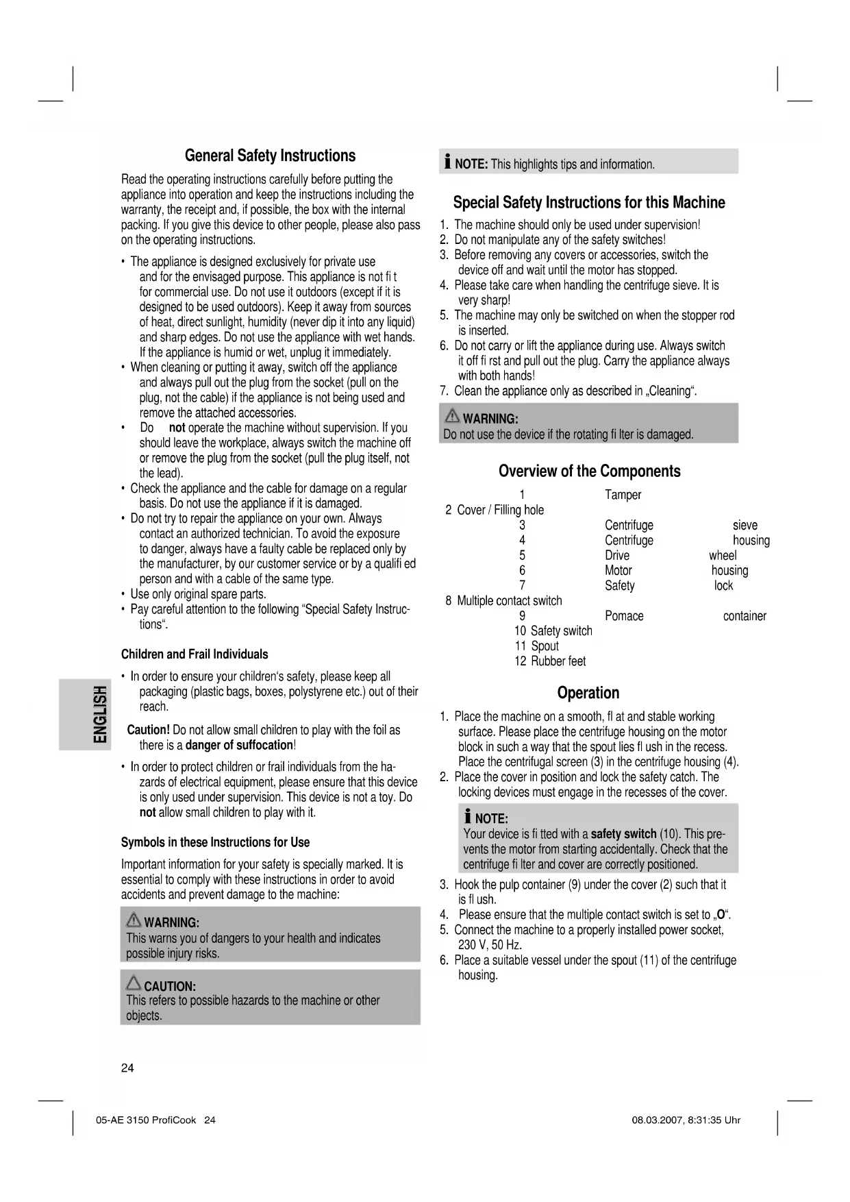 - Device is not working Remedy: Check the mains connection. Check the position of the switch. Other possible causes: The device is fi tted with a safety switch (10). This prevents the motor from starting up unintentionally. Remedy: Check that the centrifuge fi lter and cover are correctly positioned. Technical Data Model:...............................................................................AE 3150 Power supply:................................................220-240 V, 50/60 Hz Power consumption:.....................................................500-700 W Protection class:.......................................................................... ΙΙ Short-term operation:...........................................................3 Min. This device has been tested according to all relevant current CE guidelines, such as electromagnetic compatibility and low voltage directives, and has been constructed in accordance with the latest safety regulations. Subject to technical changes without prior notice! Guarantee The device supplied by our Company is covered by a 24 month guarantee starting on the date of purchase (receipt). During the life of the guarantee any fault of the device or its accessories ascribable to material or manufacturing defects will be eliminated free of charge by repairing or, at our discretion, by replacing it. The guarantee services do not entail an extension of the life of the guarantee nor do they give rise to any right to a new guarantee! Proof of the guarantee is provided by the proof of purchase. Without proof of purchase no free replacement or repair will be carried out. If you wish to make a claim under the guarantee please return the entire machine in the original packaging to your dealer together with the receipt. Defects to consumables or parts subject to wearing as well as cleaning, maintenance or the replacement of said parts are not covered by the guarantee and hence are to be paid! The guarantee lapses in case of unauthorized tampering. 05-AE 3150 ProfiCook 25 08.03.2007, 8:31:38 UhrENGLISH ENGLISH