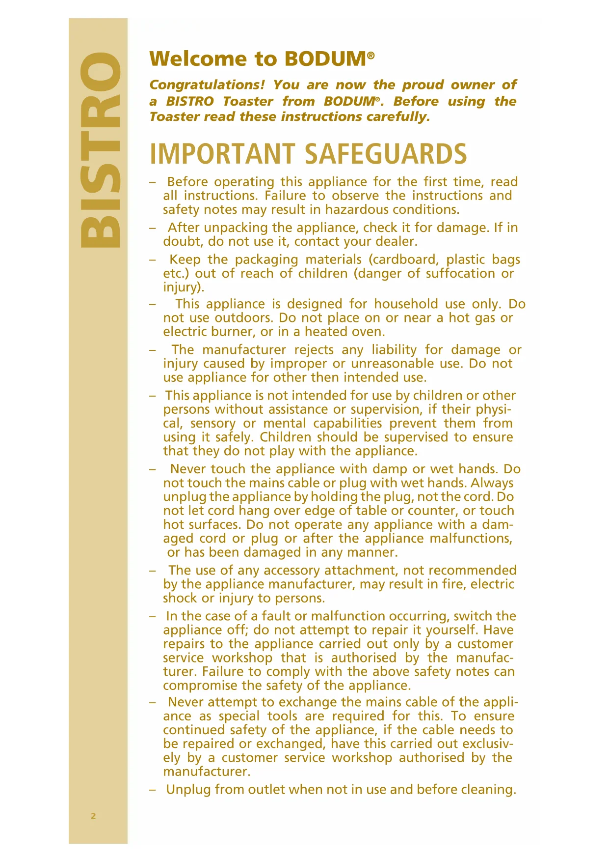 guarantees the toaster for 2 years from date of purchase against material defects or malfunctions which can be traced back to defects in manufacturing or design. Repair is free of charge provided all guarantee requirements are fulfilled. No refunds can be made. Guarantee requirements. The guarantee certificate must be completely filled out by the seller at the time of purchase. Only agents authorized by BODUM