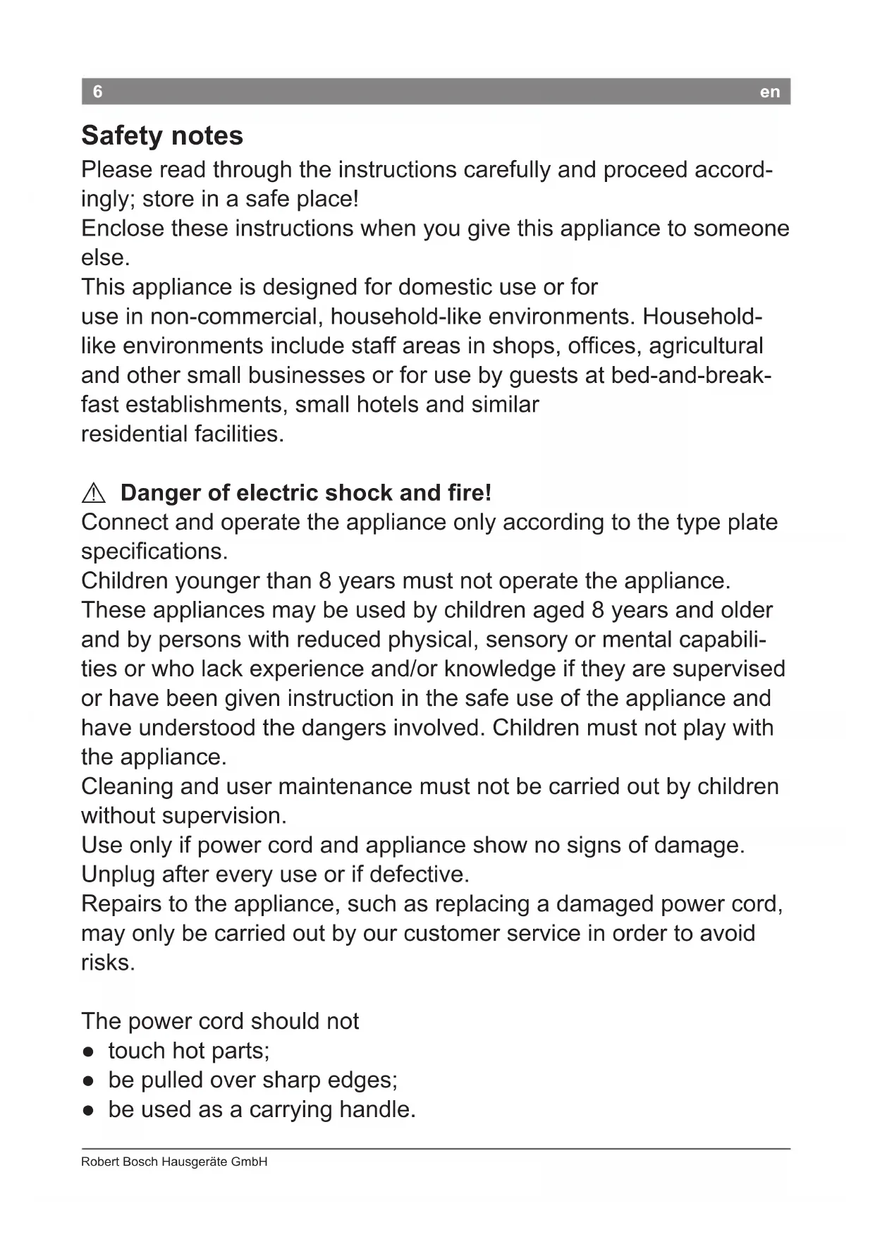 Robert Bosch Hausgeräte GmbH 6 en Safety notes Please read through the instructions carefully and proceed accord- ingly; store in a safe place! Enclose these instructions when you give this appliance to someone else. This appliance is designed for domestic use or for use in non-commercial, household-like environments. Household- like environments include staff areas in shops, ofces, agricultural and other small businesses or for use by guests at bed-and-break- fast establishments, small hotels and similar residential facilities.
