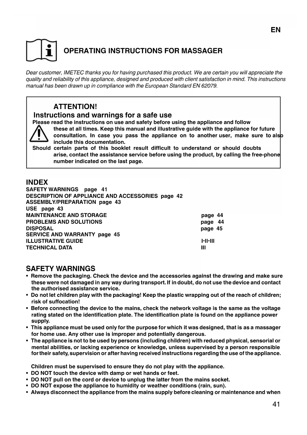 OPERATING INSTRUCTIONS FOR MASSAGER Dear customer, IMETEC thanks you for having purchased this product. We are certain you will appreciate the