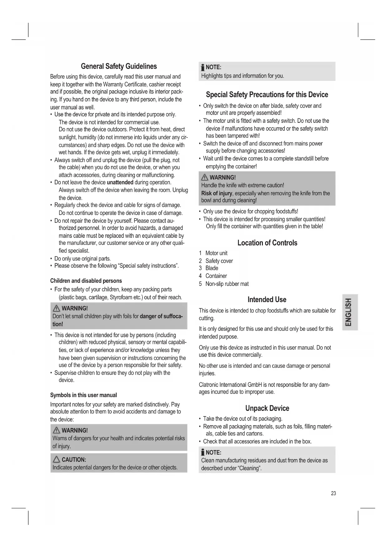 - This device is intended for processing smaller quantities! Only ll the container with quantities given in the table! Location of Controls 1 Motor unit 2 Safety cover 3 Blade 4 Container 5 Non-slip rubber mat Intended Use This device is intended to chop foodstuffs which are suitable for cutting. It is only designed for this use and should only be used for this intended purpose. Only use this device as instructed in this user manual. Do not use this device commercially. No other use is intended and can cause damage or personal injuries. Clatronic International GmbH is not responsible for any dam- ages incurred due to improper use. Unpack Device