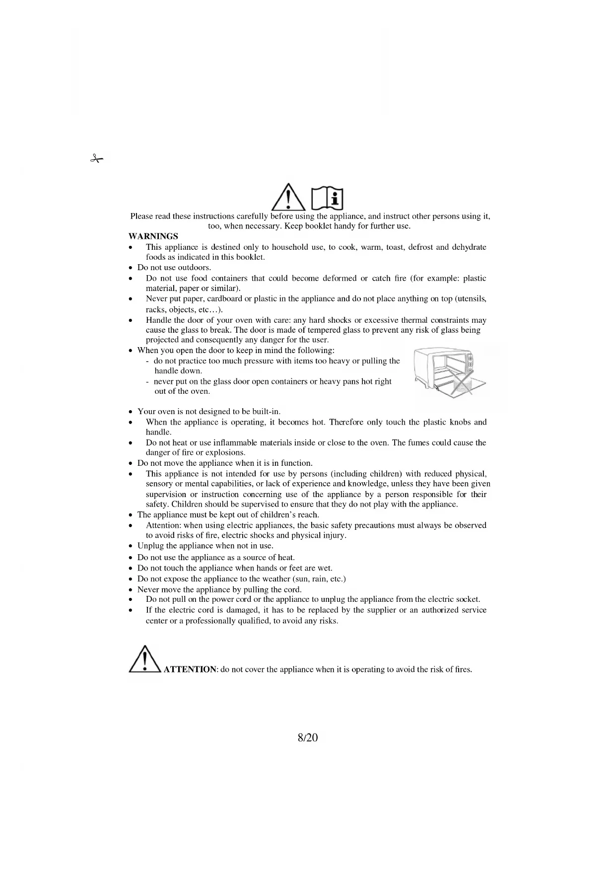 ATTENTION: do not cover the appliance when it is operating to avoid the risk of fires.