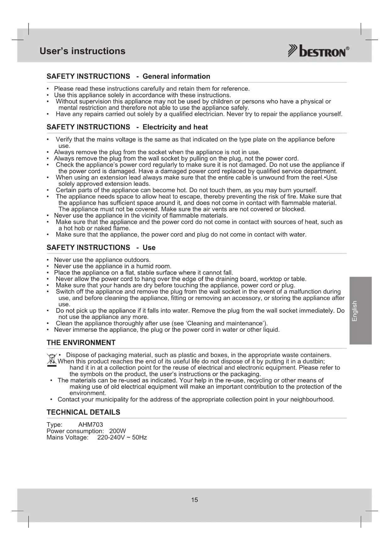 - Contact your municipality for the address of the appropriate collection point in your neighbourhood. TECHNICAL DETAILS Type: AHM703 Power consumption: 200W Mains Voltage: 220-240V ~ 50HzUser’s instructions