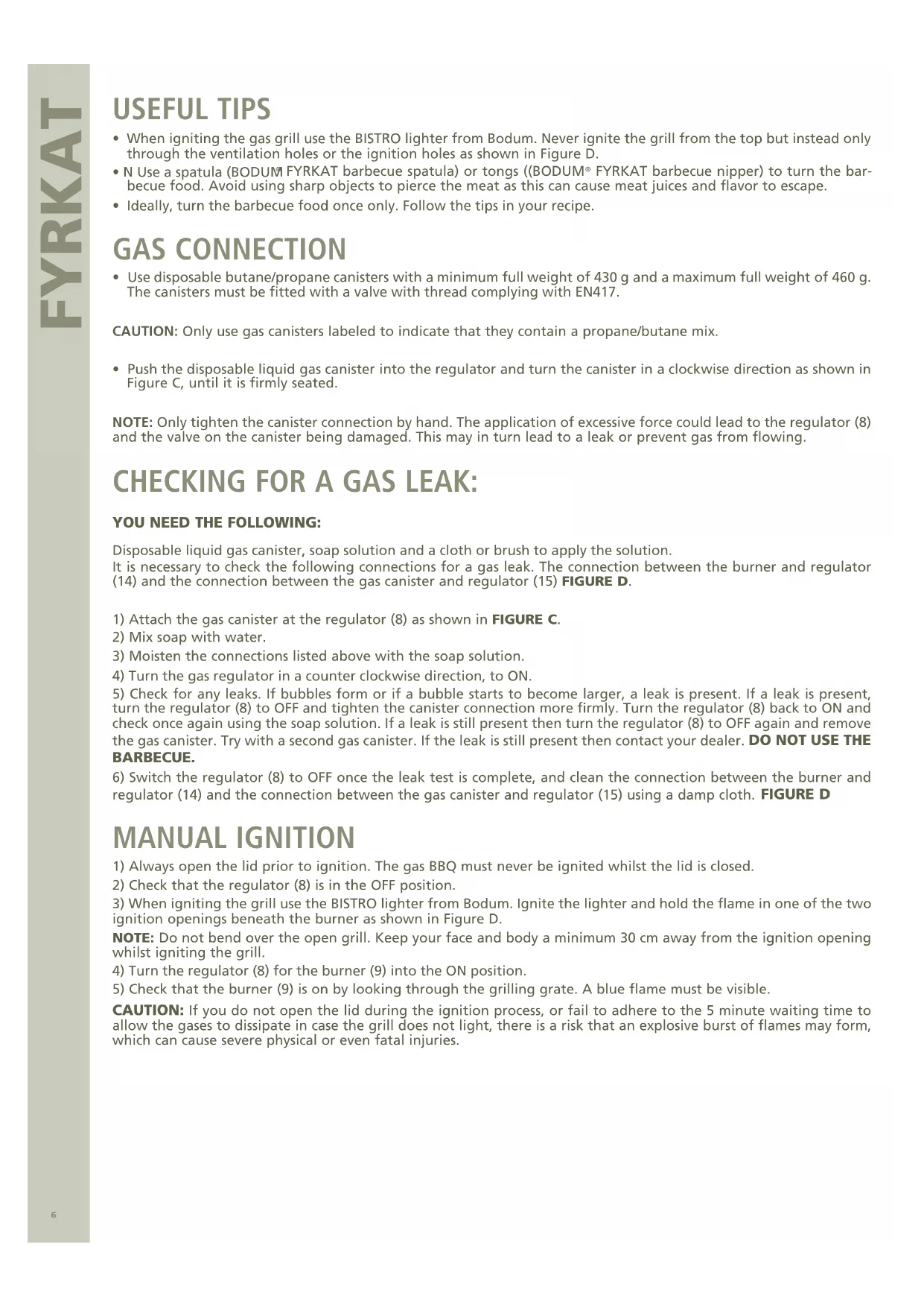 - When igniting the gas grill use the BISTRO lighter from Bodum. Never ignite the grill from the top but instead only through the ventilation holes or the ignition holes as shown in Figure D.