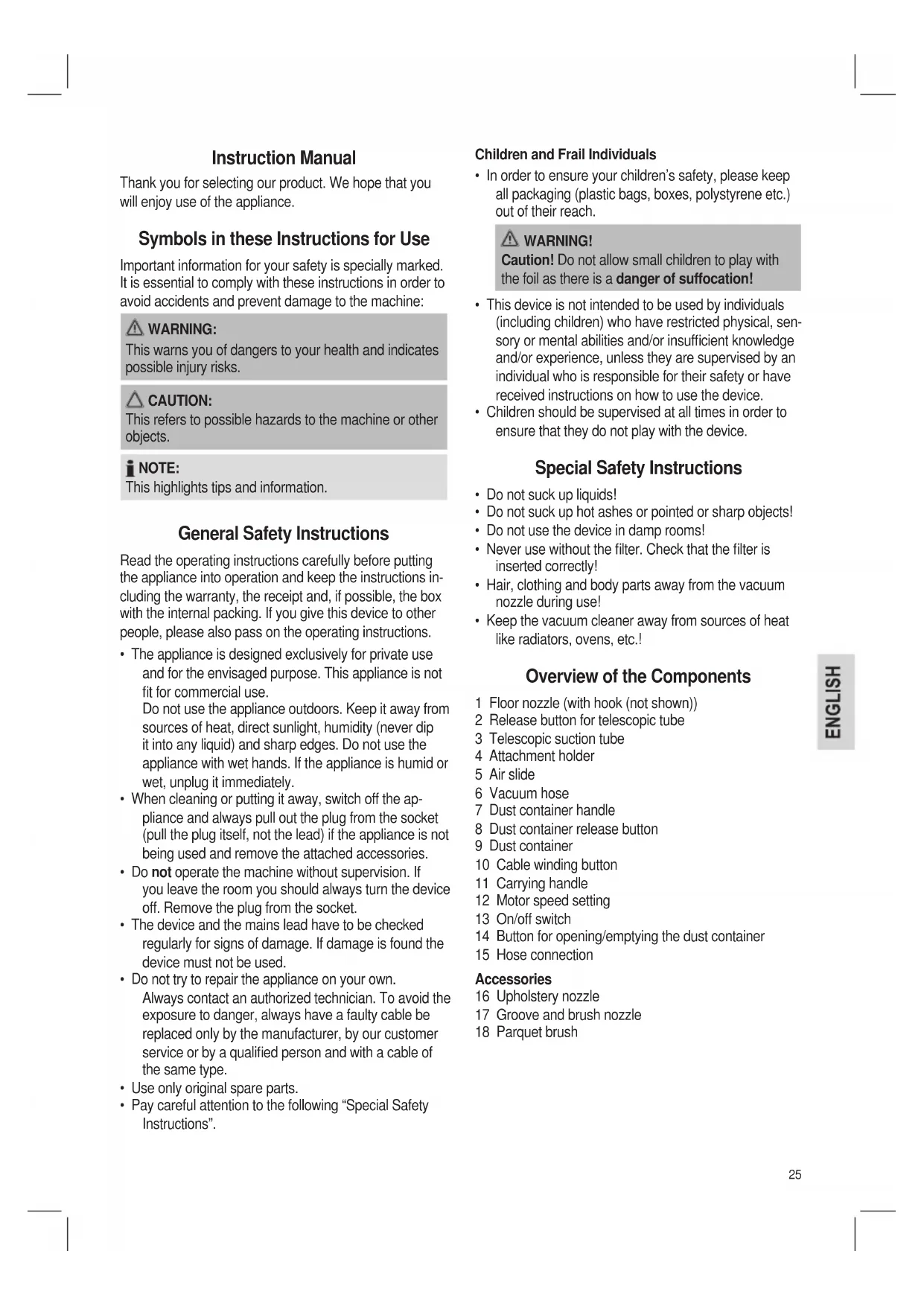 - Keep the vacuum cleaner away from sources of heat like radiators, ovens, etc.! Overview of the Components 1 Floor nozzle (with hook (not shown)) 2 Release button for telescopic tube 3 Telescopic suction tube 4 Attachment holder 5 Air slide 6 Vacuum hose 7 Dust container handle 8 Dust container release button 9 Dust container 10 Cable winding button 11 Carrying handle 12 Motor speed setting 13 On/off switch 14 Button for opening/emptying the dust container 15 Hose connection Accessories 16 Upholstery nozzle 17 Groove and brush nozzle 18 Parquet brush Instruction Manual Thank you for selecting our product. We hope that you will enjoy use of the appliance. Symbols in these Instructions for Use Important information for your safety is specially marked. It is essential to comply with these instructions in order to avoid accidents and prevent damage to the machine: