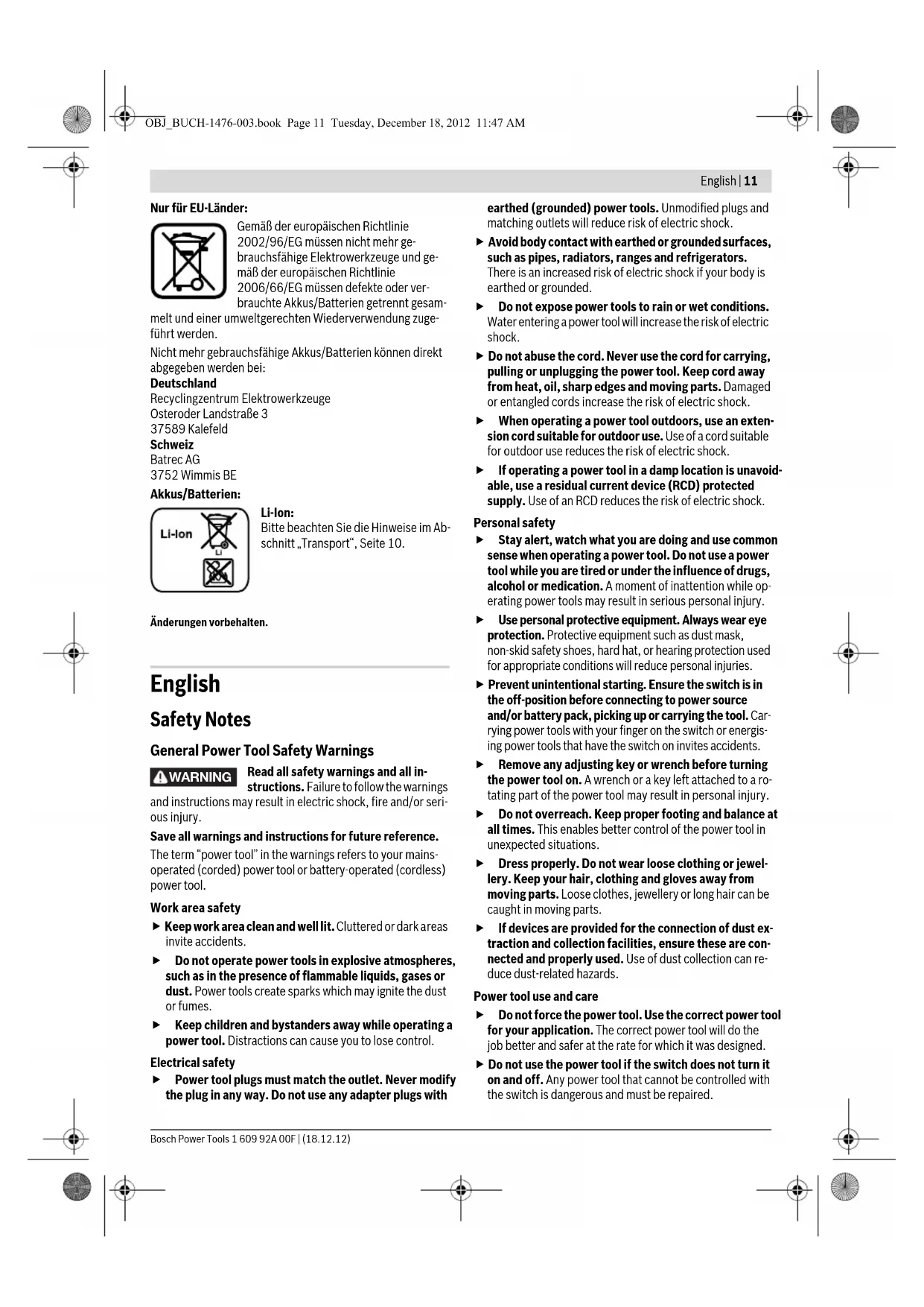OBJ_BUCH-1476-003.book Page 3 Tuesday, December 18, 2012 11:47 AM1 609 92A 00F | (18.12.12) Bosch Power Tools