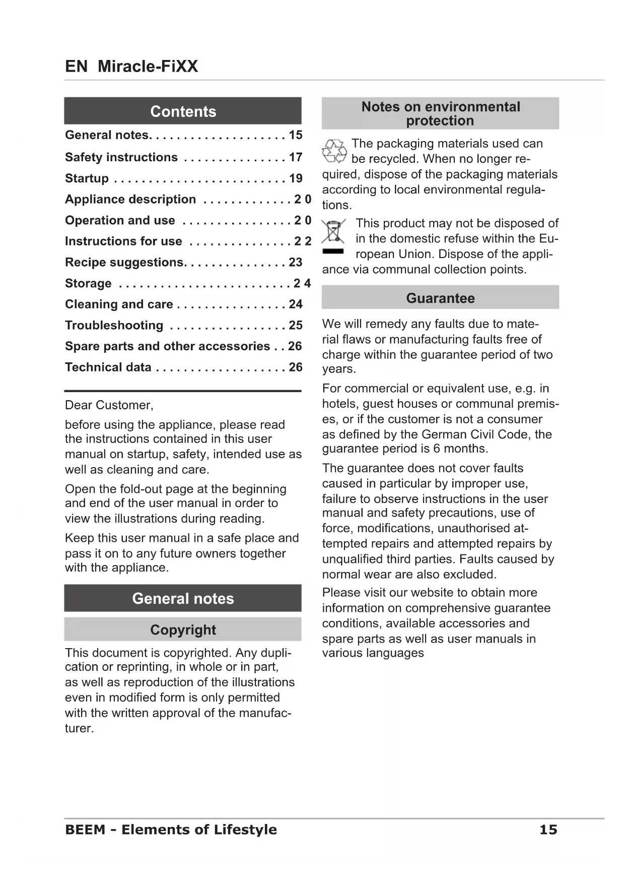 BEEM hereby declares that this appliance complies with the fundamental requirements and other relevant provisions of 2006/95/EC and 2004/108/EC directives. The full declaration of conformity can be found under www.beem.de.