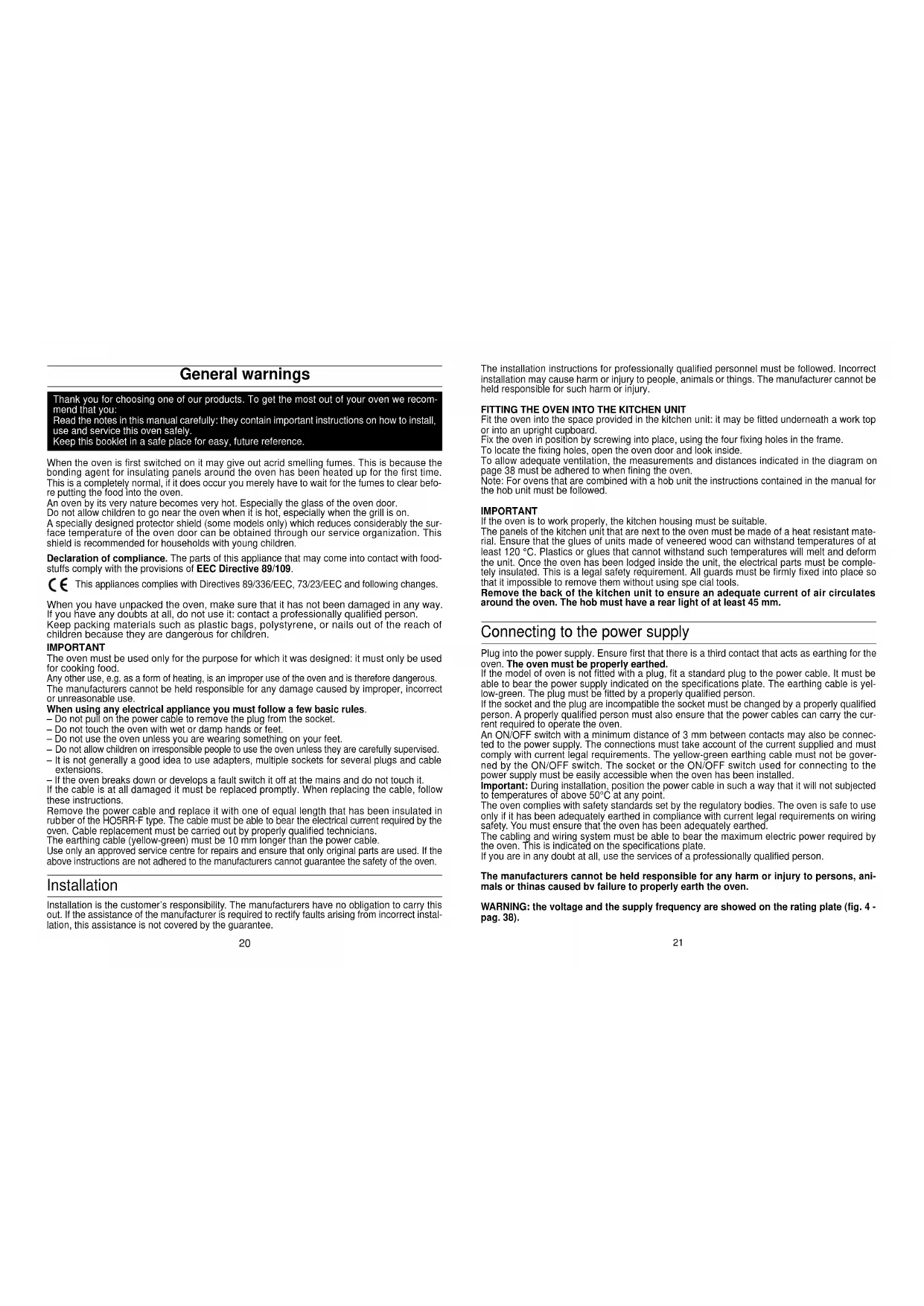 This appliances complies with Directives 89/336/EEC, 73/23/EEC and following changes.